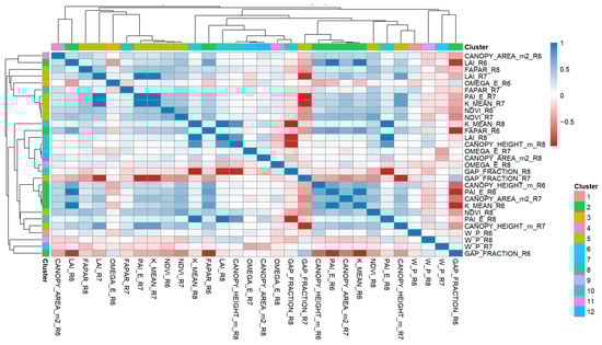 The correlation analysis and VIF values confirmed pronounced redundancies among the physiological and structural predictors. Vigor indices (NDVI, LAI, FAPAR, PAI_E) formed a highly correlated block, as did canopy openness variables (GAP_FRACTION) and radiative attributes (W_P, ΩE). The hierarchical clustering heatmap (Figure 8) reflected these patterns, showing that much of the variability was concentrated within a few functional groups.