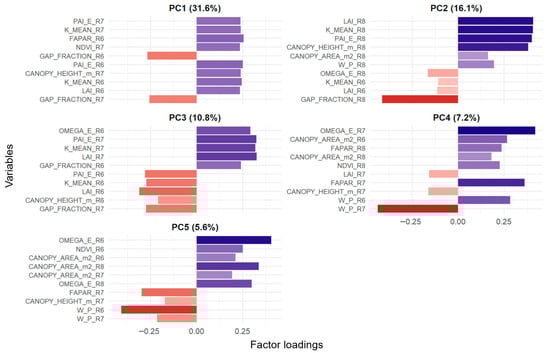 The individual contributions (Figure 7) confirmed that PC1 encapsulated indicators of canopy vigor and radiation interception efficiency during R6–R7, whereas PC2 represented mature canopy architecture at R8.