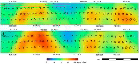 Each plant was individually identified and delineated in the orthomosaics using the planting framework (1.0 × 1.5 m) as a spatial reference. The ~2 cm/pixel resolution enabled precise canopy segmentation and the extraction of spectral values (NDVI) and projected canopy area for each plant.