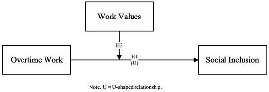The relationship between overtime work and social inclusion is U-shaped, such that the relationship between overtime work and social inclusion will be negative at the short overtime hours and become positive at long overtime hours.