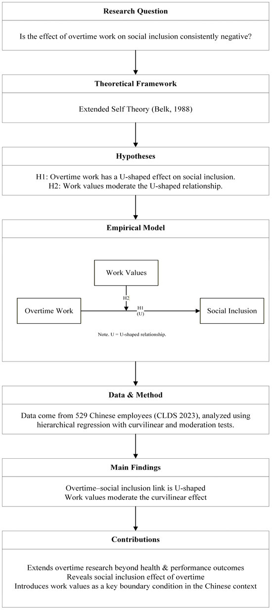 These cultural distinctions suggest that overtime work is not interpreted uniformly across societies, and that employees’ work values play a crucial role in determining whether overtime is perceived as a burden or as a meaningful investment. Therefore, incorporating work values as a moderating variable enables us to capture individual differences in the relationship between overtime and social inclusion and provides a culturally grounded explanation for how overtime functions in the Chinese context.