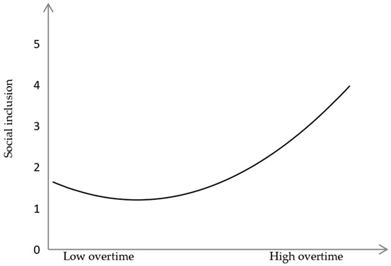 Over the past 30 years, per capita labor hours have risen [20], suggesting a reduction in time available for social interaction, hence potentially diminishing individual social inclusion. Nonetheless, some scholars have posited that overtime work may confer advantages for social inclusion. Empirical evidence has suggested that individuals whose working hours are longer also have higher social communication [20,21]. Kikuch and his colleagues found that workers with 61–80 h of monthly overtime were more likely to feel vigorous than workers with shorter work hours [22]. Putnam demonstrated that employed individuals belong to more civic groups than individuals not in the labor force [23]. Kaasa and Parts found that employment positively affects participation in formal and informal networks [24]. Putnam proposed that employees who work long hours are inclined to engage in civic engagement [23]. Anecdotally, Jack Ma, founder of Alibaba, is known to have been an inveterate workaholic. He said that employees who work overtime at Alibaba could not only earn good income for themselves but also contribute to social development, such as promoting public welfare undertakings and improving social participation [25]. An adage states that what you lose on the swings, you get back on the roundabouts. Individuals who work extended hours may allocate less time to social activities after work, yet they engage more frequently with leaders and coworkers, enhancing their social inclusion within the community. While these scholarly speculations and anecdotal clues suggest that there may be conditions under which overtime work is conducive to social inclusion, this idea has yet to be theoretically developed or empirically tested. Concretely, we consider when overtime hours are relatively long, a rise in expected outcome social inclusion could occur.