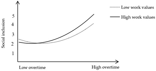 Hypothesis 2 predicts that work values moderates the curvilinear relationship between overtime work and social inclusion. In Model 5, work values, its interaction with overtime work and the product of work values and overtime work squared were all included. Table 3 summarises the parameter estimates related to the two interaction terms and (Equation (3)). The parameter estimate of β4 (β4 = 0.165, p < 0.05), the linear interaction term for overtime work and social inclusion, is statistically significant, while the parameter estimate of β5 (β5 = −0.074, ns), the squared interaction term, is not statistically significant, thus satisfying the condition for the moderation hypothesis. A further comparison of Equations (2) and (3) indicated that Equation (3) performed better with the change in R2 = 0.024. Therefore, Hypothesis 2 is supported. In order to clearly reveal the moderating role of work values on the U-shaped relationship between overtime work and social inclusion, we plotted the interaction in Figure 4, referring to the procedures outlined by Bauer and Curran [77].