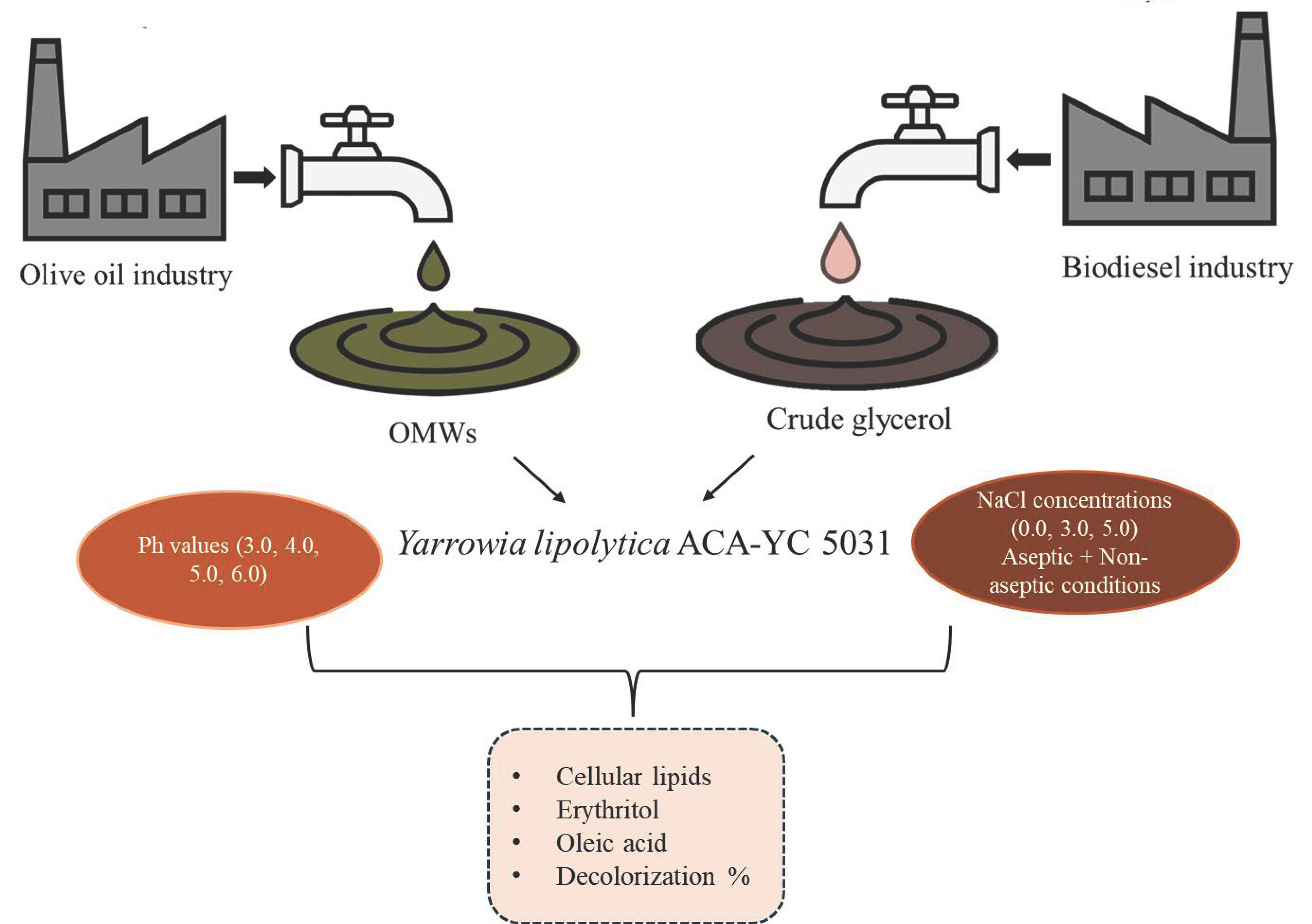 - Sarris, D.; Stoforos, N.G.; Mallouchos, A.; Kookos, I.K.; Koutinas, A.A.; Aggelis, G.; Papanikolaou, S. Production of added-value metabolites by Yarrowia lipolytica growing in olive mill wastewater-based media under aseptic and non-aseptic conditions. Eng. Life Sci. 2017, 17, 695–709. [Google Scholar] [CrossRef] [PubMed]