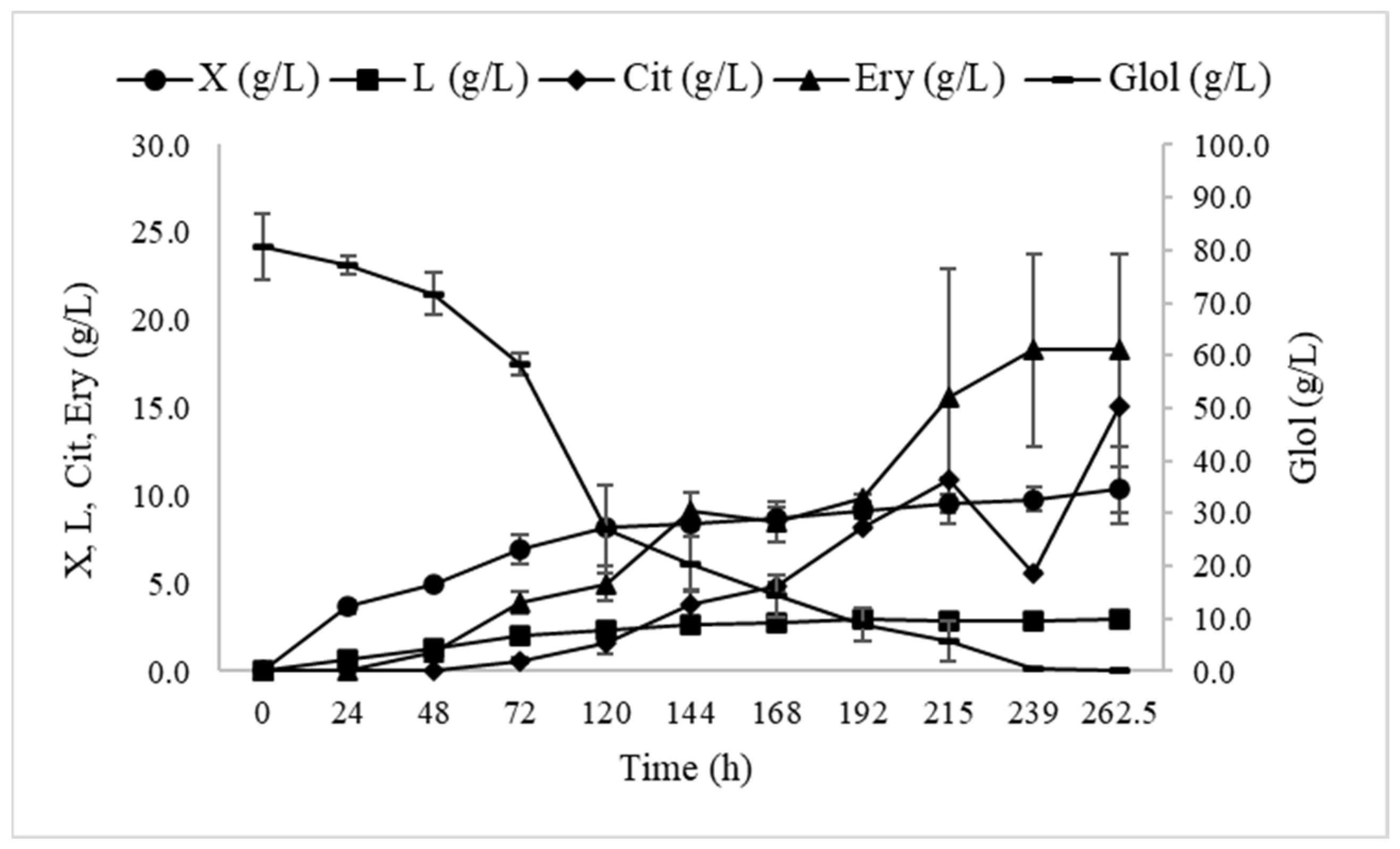 | YEry/Glol | Yield of erythritol on glycerol consumed (g/g) |