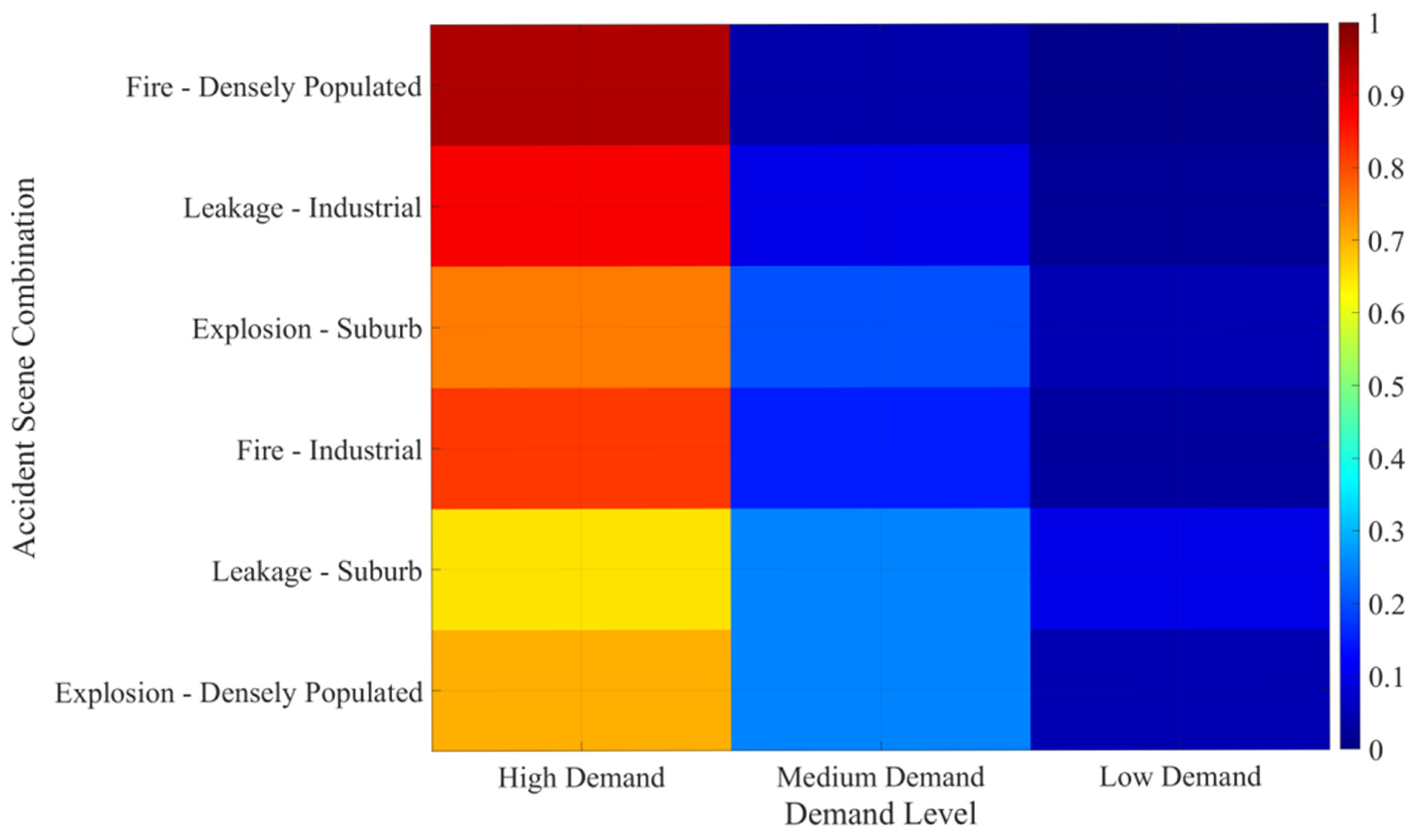 Bayesian network inference: prior probability: P (Cluster = high) = 1, P (Hazard Type = Flammable|Cluster = high) = 0.80; likelihood update: P (Accident Type = Fire|Hazard Type = Flammable) = 0.70 → 0.78 (calculated by CPT table interpolation) after 15% increase in traffic volume; posterior prediction: P (Demand = high|Accident Type = Fire, Environment = dense population) = 0.88, P (Demand = medium) = 10, P (Demand = low) = 0.02.