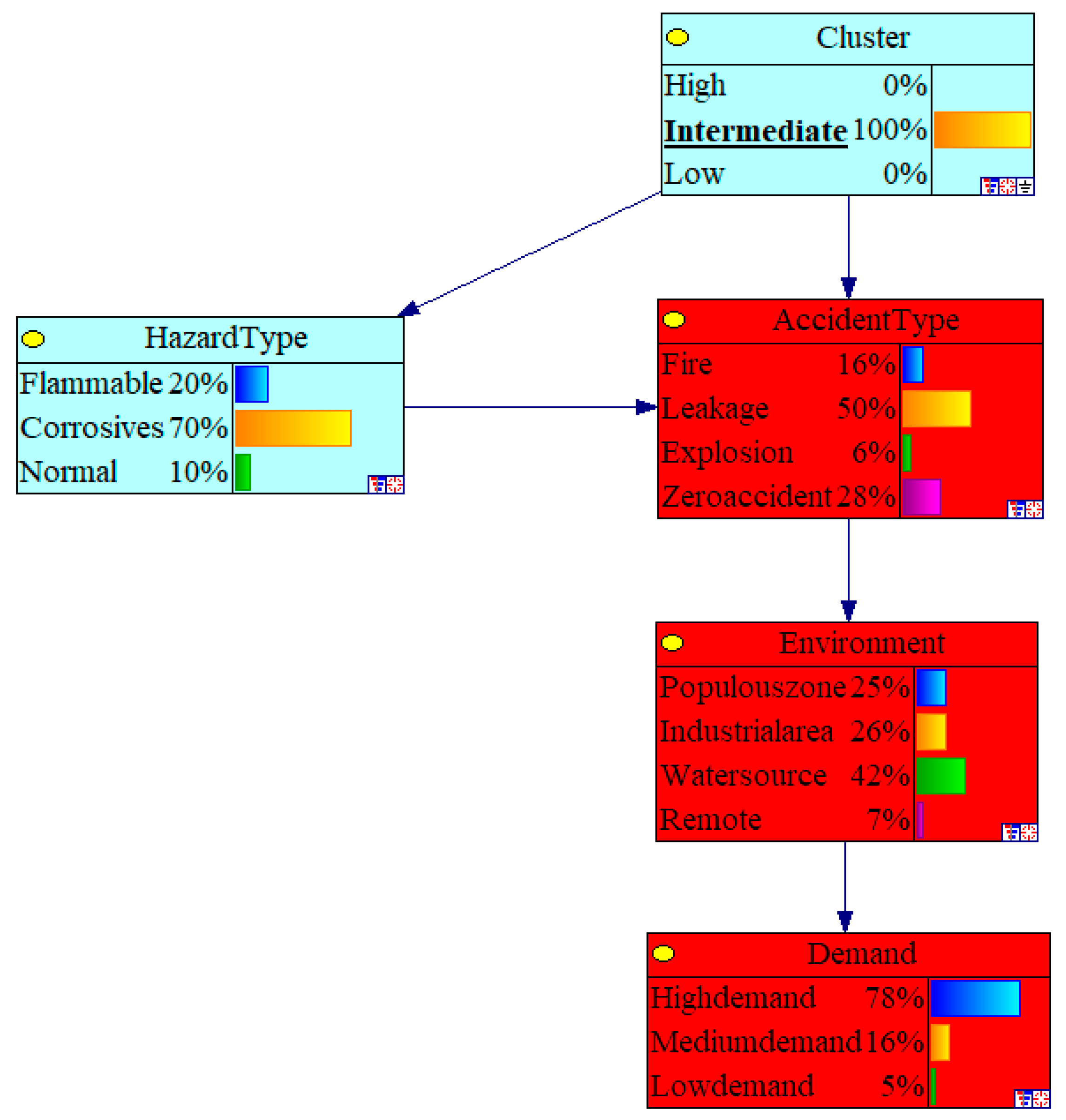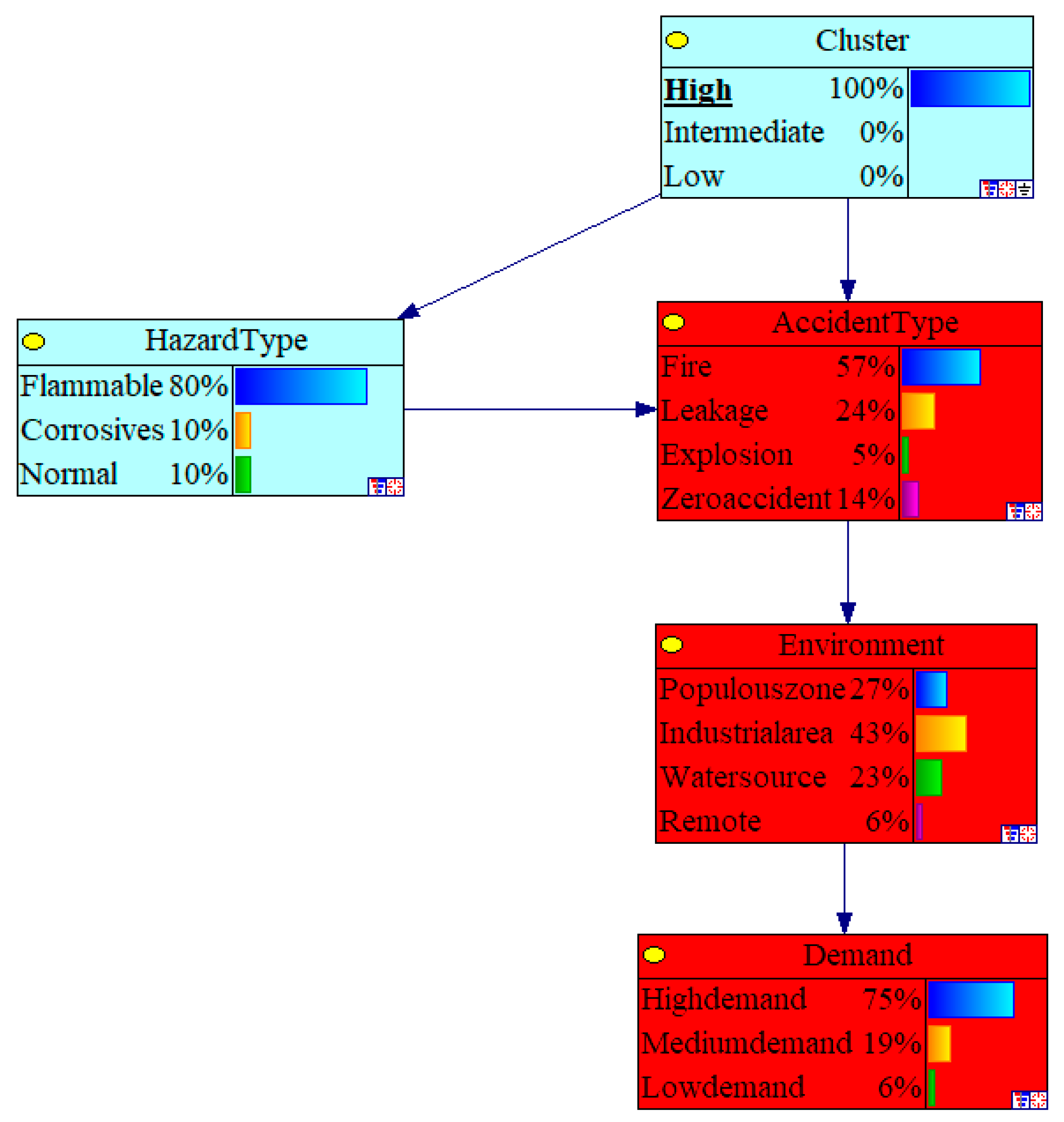 The industrial zone environment makes P (Demand = high|Explosion = 0.95 → 0.97 (large engineering equipment required). P (Demand = medium) = 0.03, P (Demand = low) = 0.00.