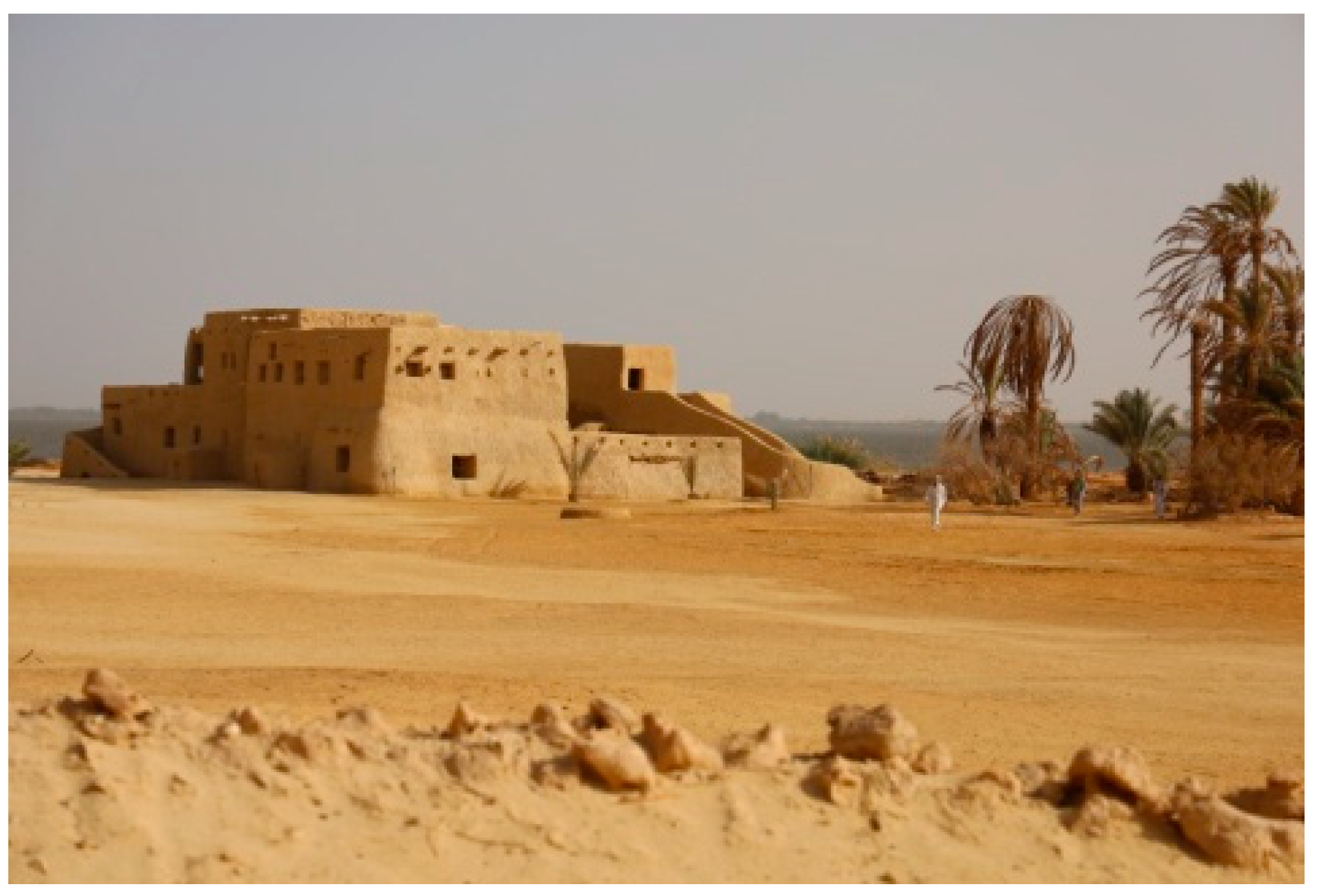 - Khalil, M. Lessons Learnt from Adaptive Reuse of Earthen Heritage in Desert Oases in Hot Arid Climates. In Proceedings of the HERITAGE2025 International Conference on Earthen and Vernacular Heritage: Conservation, Adaptive Reuse and Urban Regeneration, Valencia, Spain, 10–12 September 2025. [Google Scholar] [CrossRef]