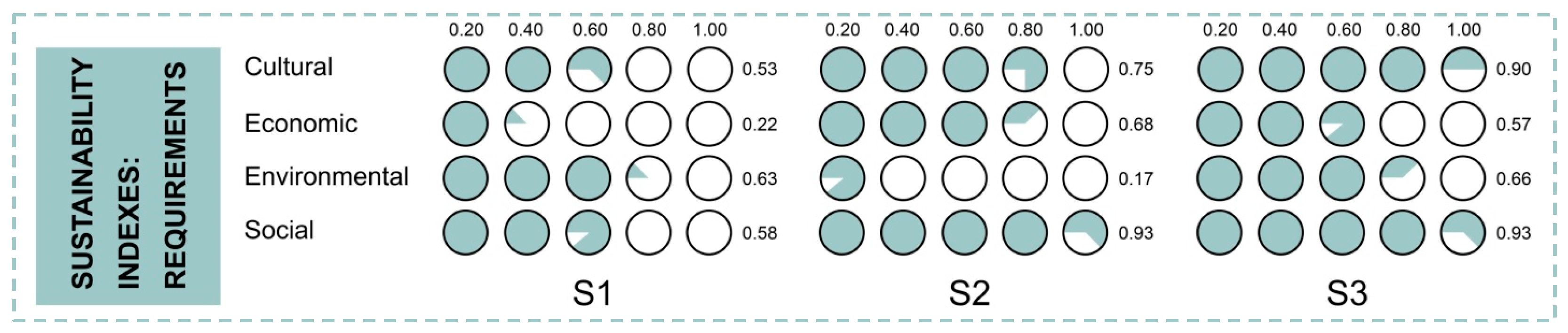 - Social requirement (R4) presented the highest sustainability values for S2 and S3. Similar to R1, it benefited from the third Delphi round, which emphasized the knowledge, acceptance and perceived safety of the community—factors that significantly favored Karshif.