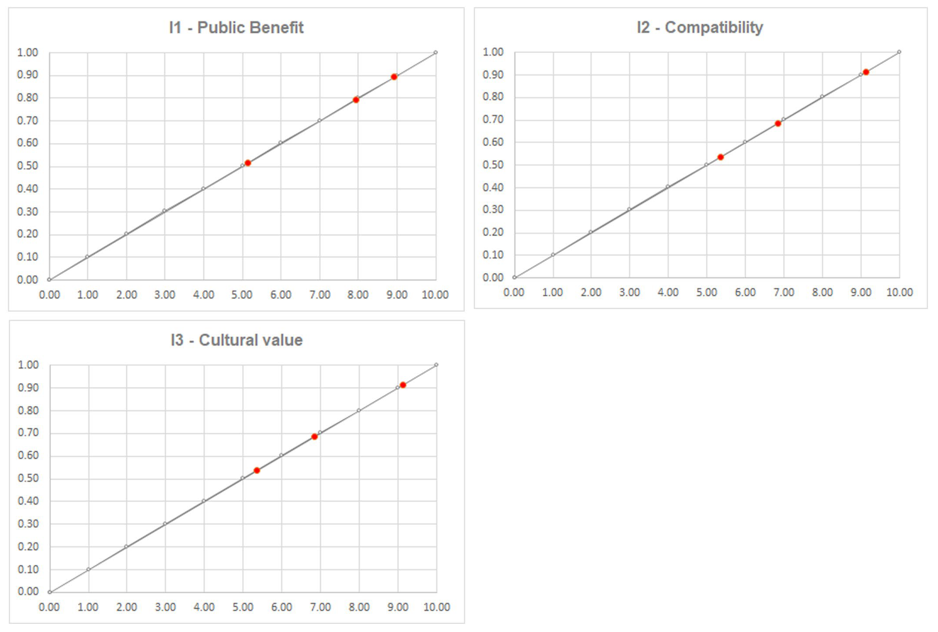 | I1—Public benefit and immortality value (100%) | Points | Linear | Increasing | 0 | 10 | 5 | 0.01 | 1 |