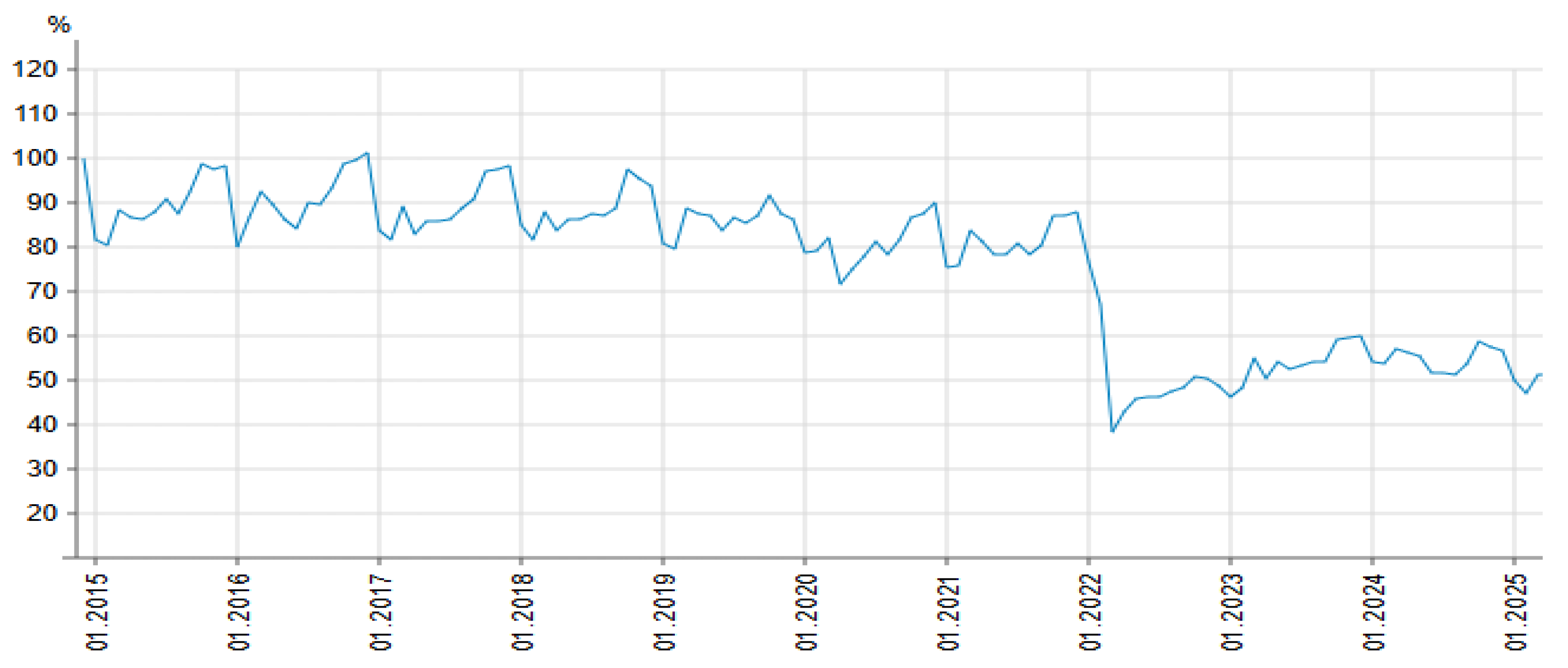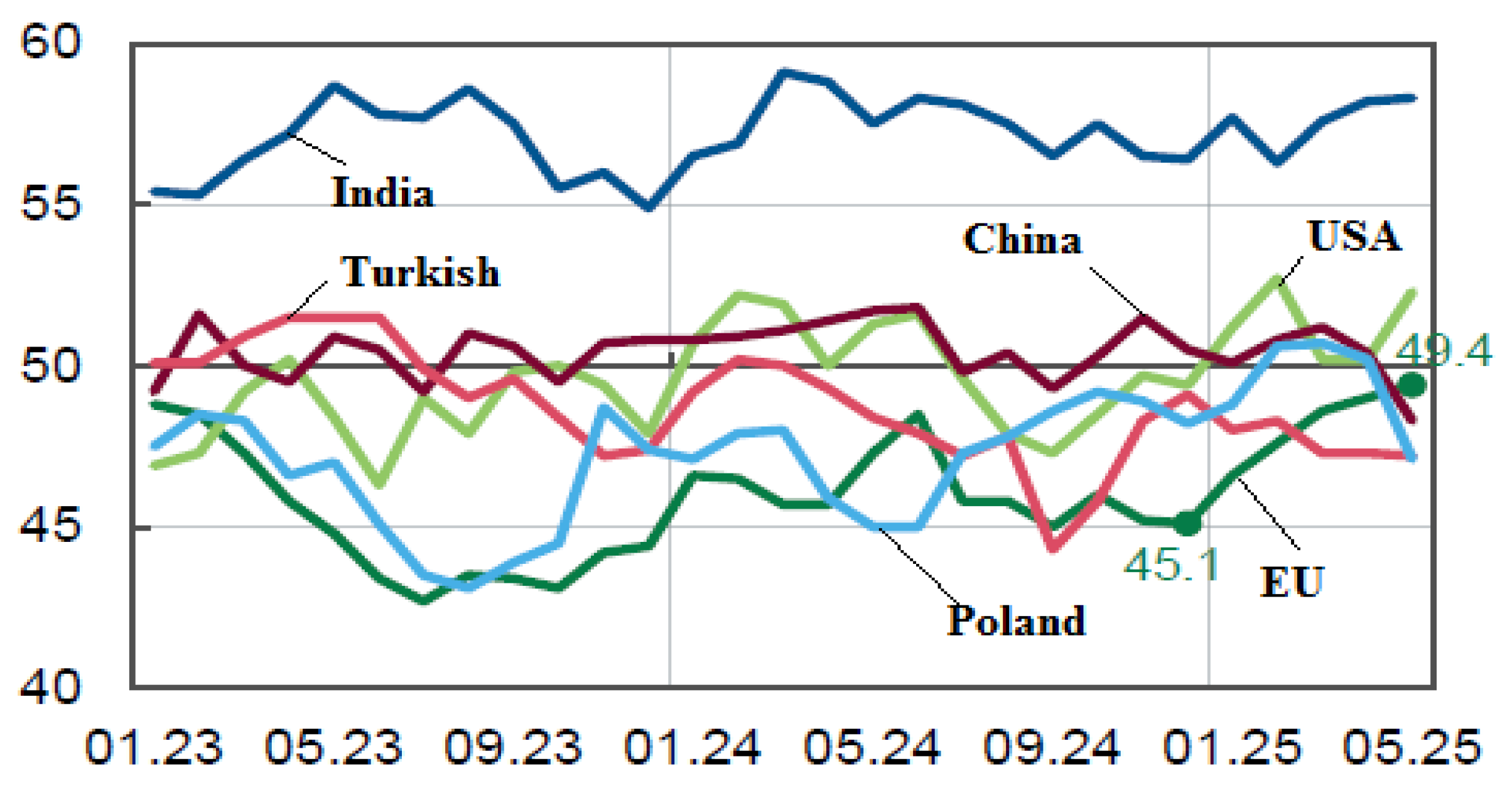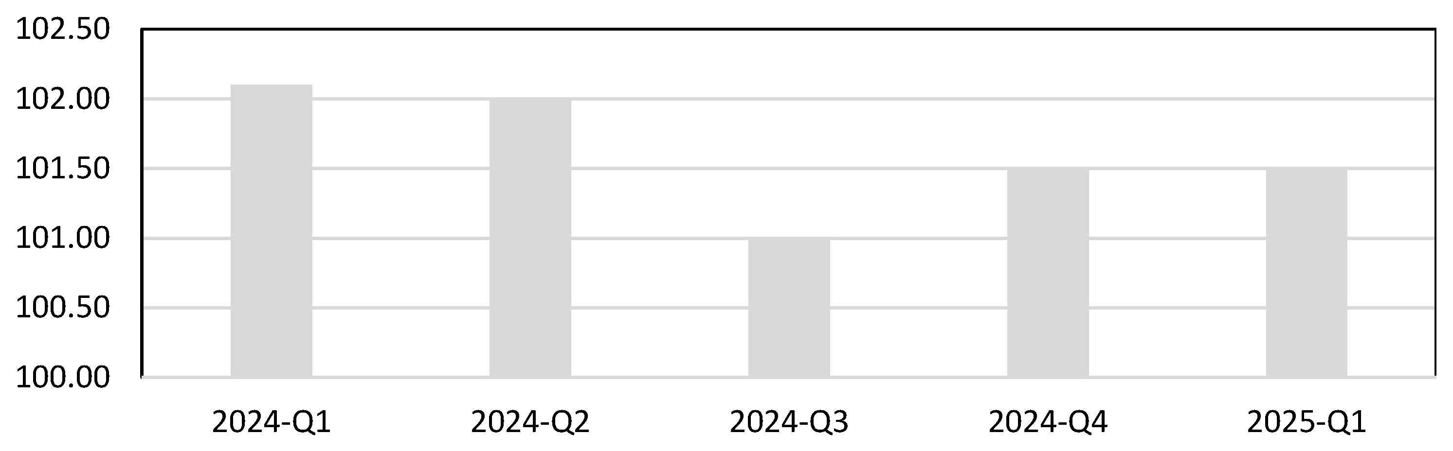 Figure 2 indicates that the Business Confidence Index in the EU-27 declined during 2022–2024. This trend suggests a deterioration of economic processes within the EU and the potential onset of a recession, driven by factors such as Russia’s war against Ukraine and trade conflicts involving the United States—particularly the U.S.–EU-27 trade agreement, which appears disadvantageous for the European side.