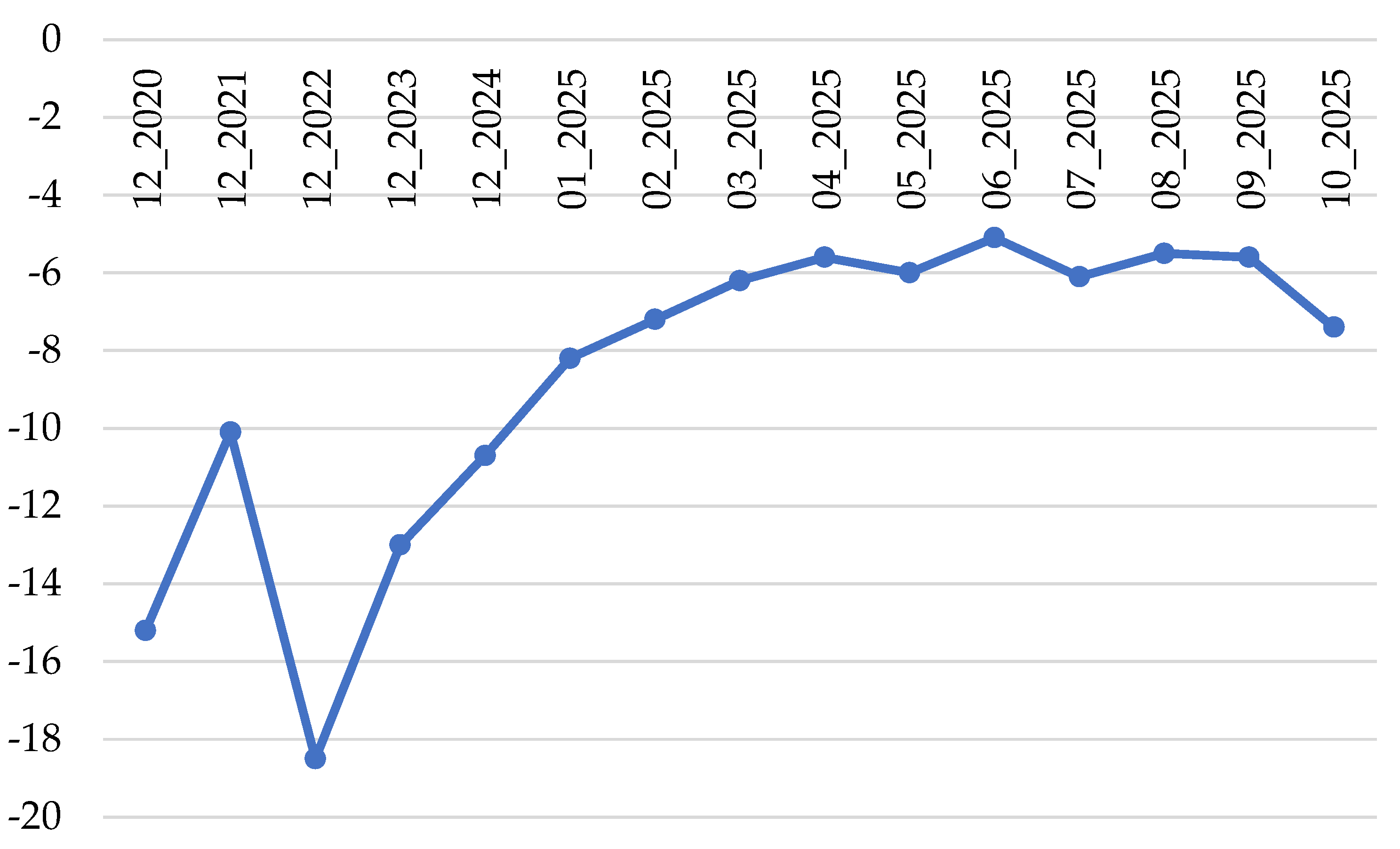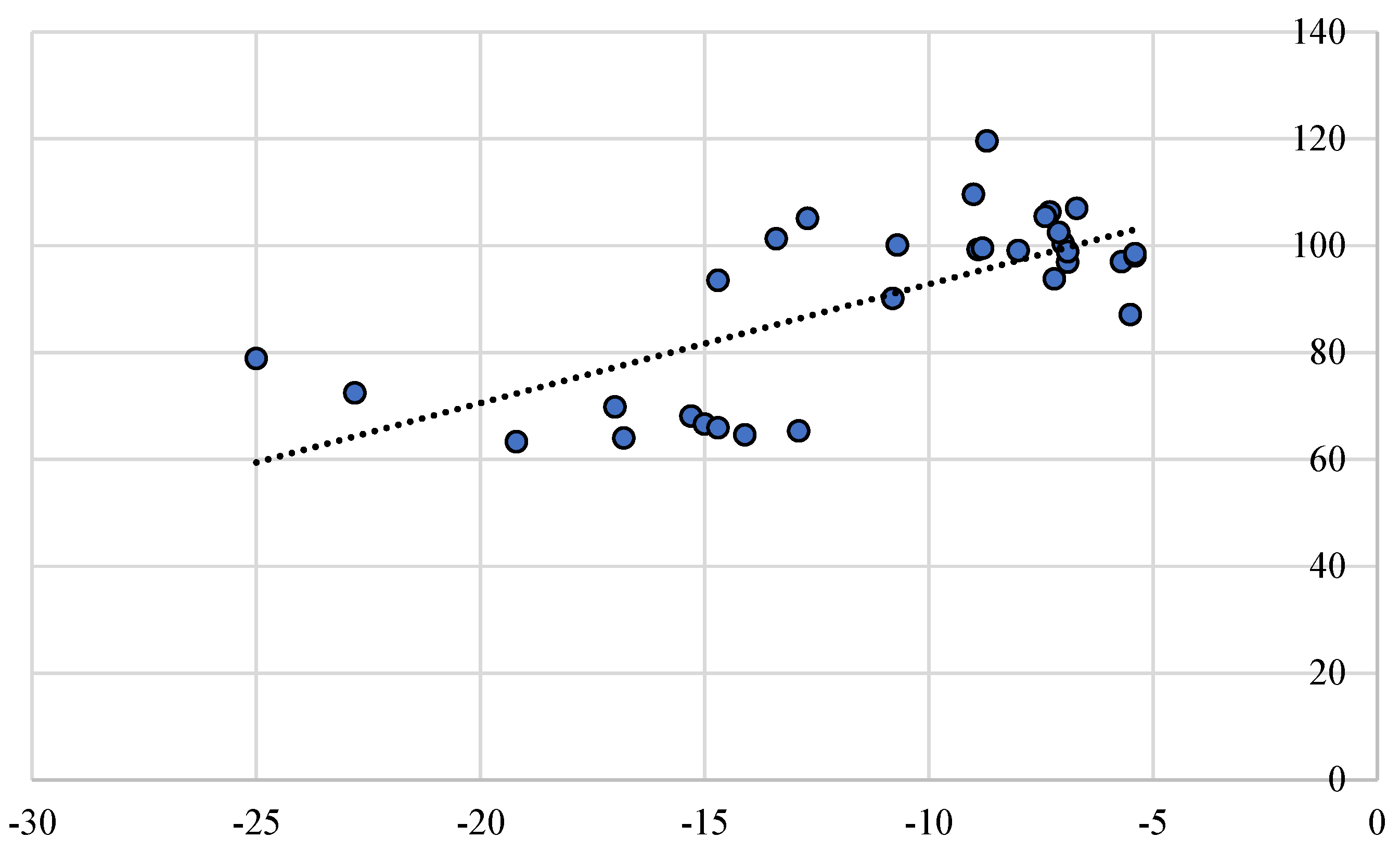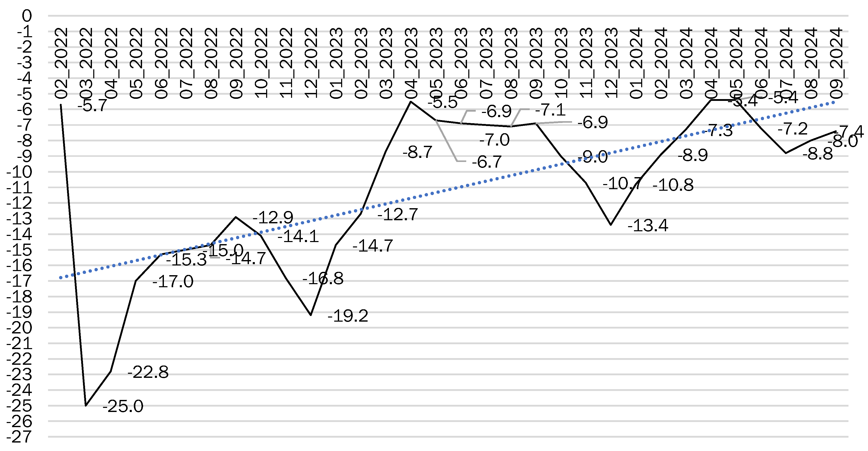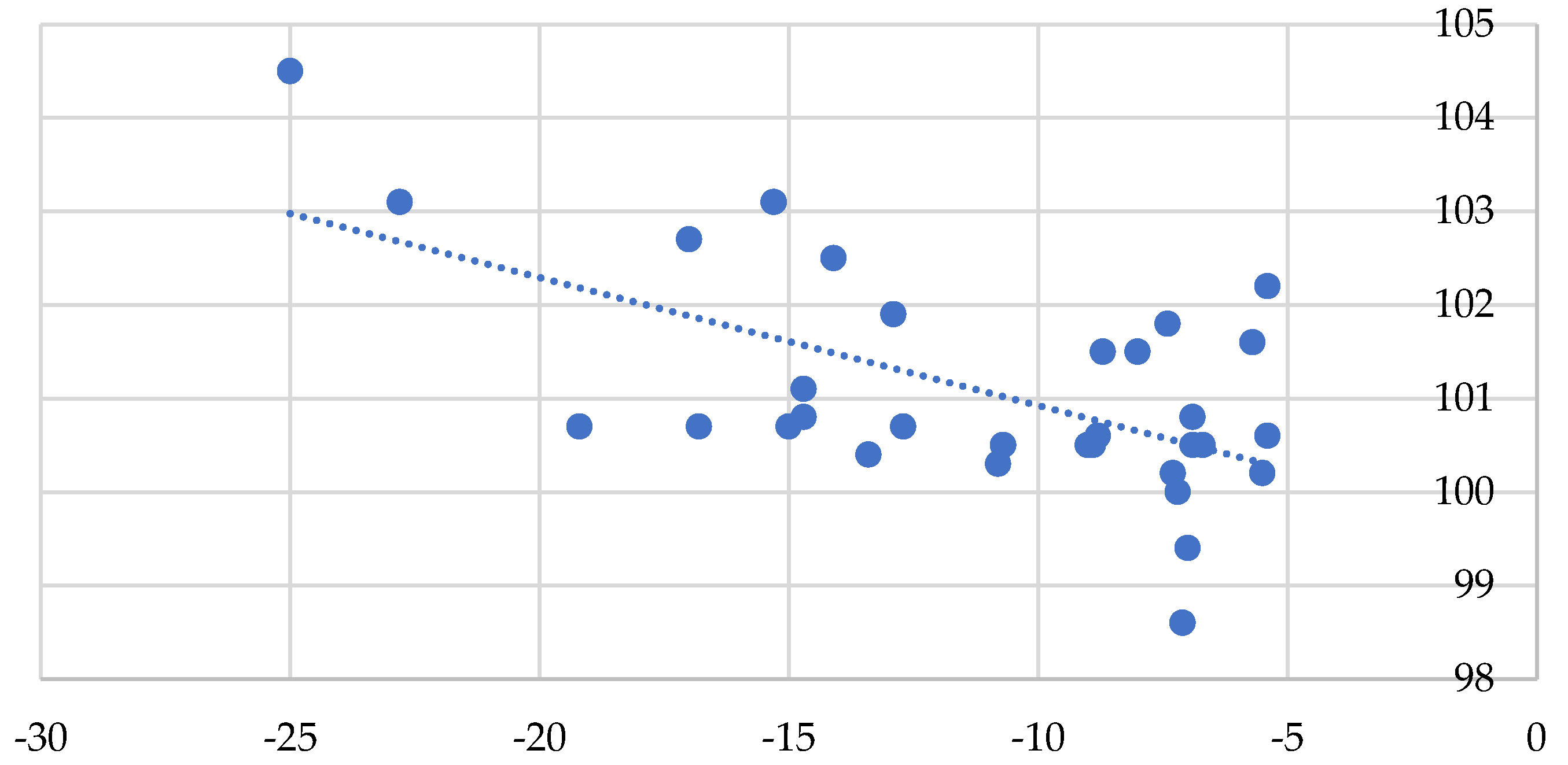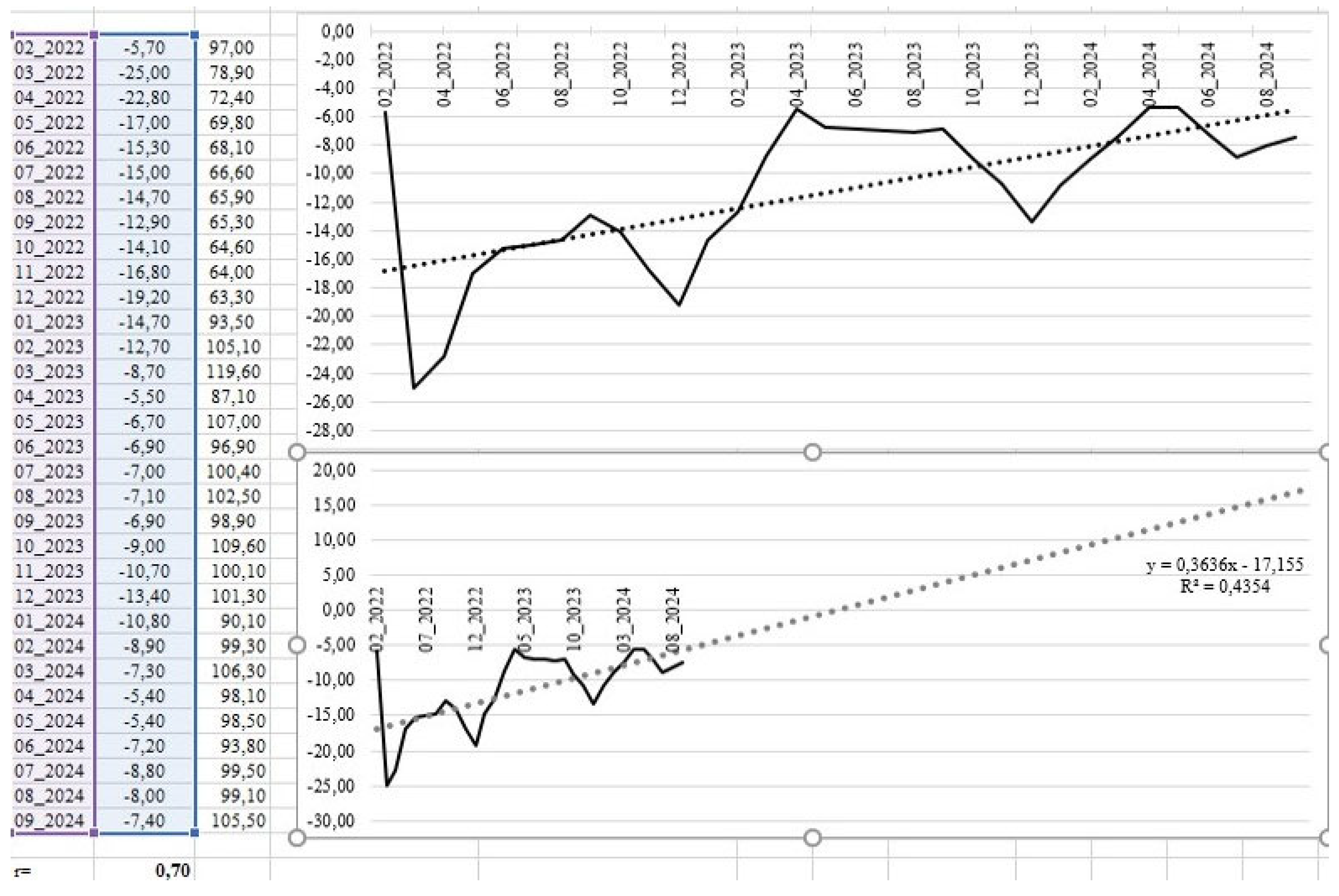 The main statistical indicators of the above trend equation are as follows: mean value—–11.2; standard deviation—5.2; number of observations—32; 95% confidence interval for the mean