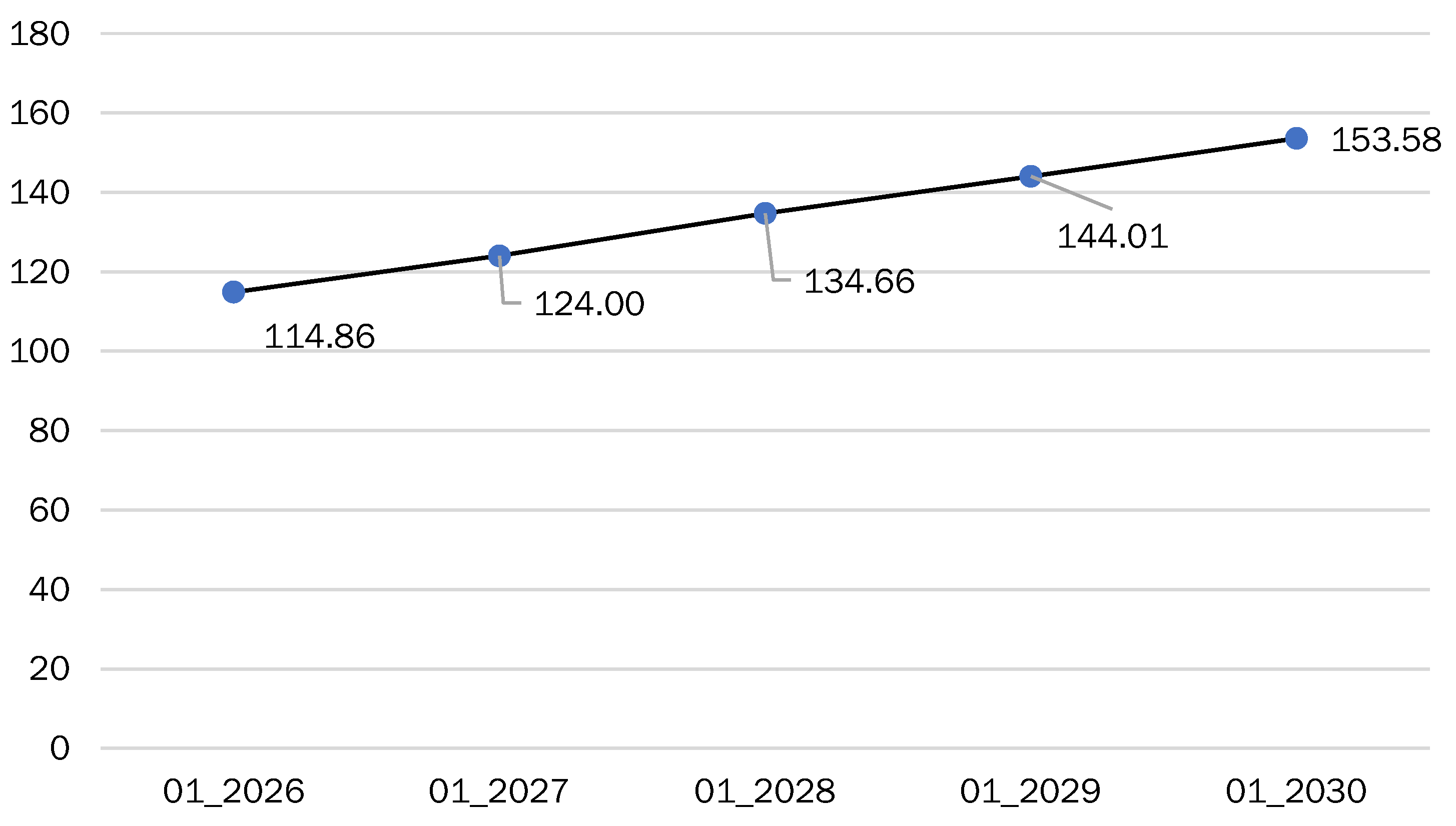 Specifically, the IBCI is projected as follows: January 2026—0.1%; January 2027—4.0%; January 2028—8.8%; January 2029—13.0%; January 2030—17.3%. The forecasted values were calculated based on the trend line constructed in MS Excel. A general excerpt of the calculation on the spreadsheet is shown in