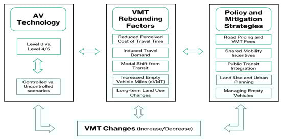 Autonomous vehicles (AVs) refer to vehicles capable of operating either partially or fully without human interventions. These vehicles are rapidly evolving from futuristic concepts into practical realities on roads around the world. AVs may offer benefits, including improved road safety, enhanced mobility for individuals who cannot drive, and increased efficiency within transportation systems. However, AVs also present important challenges, a major one being the potential increase in vehicle miles traveled (VMT). This is often referred to as a rebound effect. This phenomenon occurs when the convenience of automated driving encourages individuals to travel more frequently, cover longer distances, or shift from using public transit and active transportation modes like walking and cycling to AVs or shared autonomous vehicles (SAVs). For instance, studies of partially automated driving systems (SAE Levels 2–3) show that drivers using such systems drive substantially more miles annually [,]. Early study by Fagnant and Kockelman predicted that induced travel and empty repositioning driven by automation could increase VMT [].