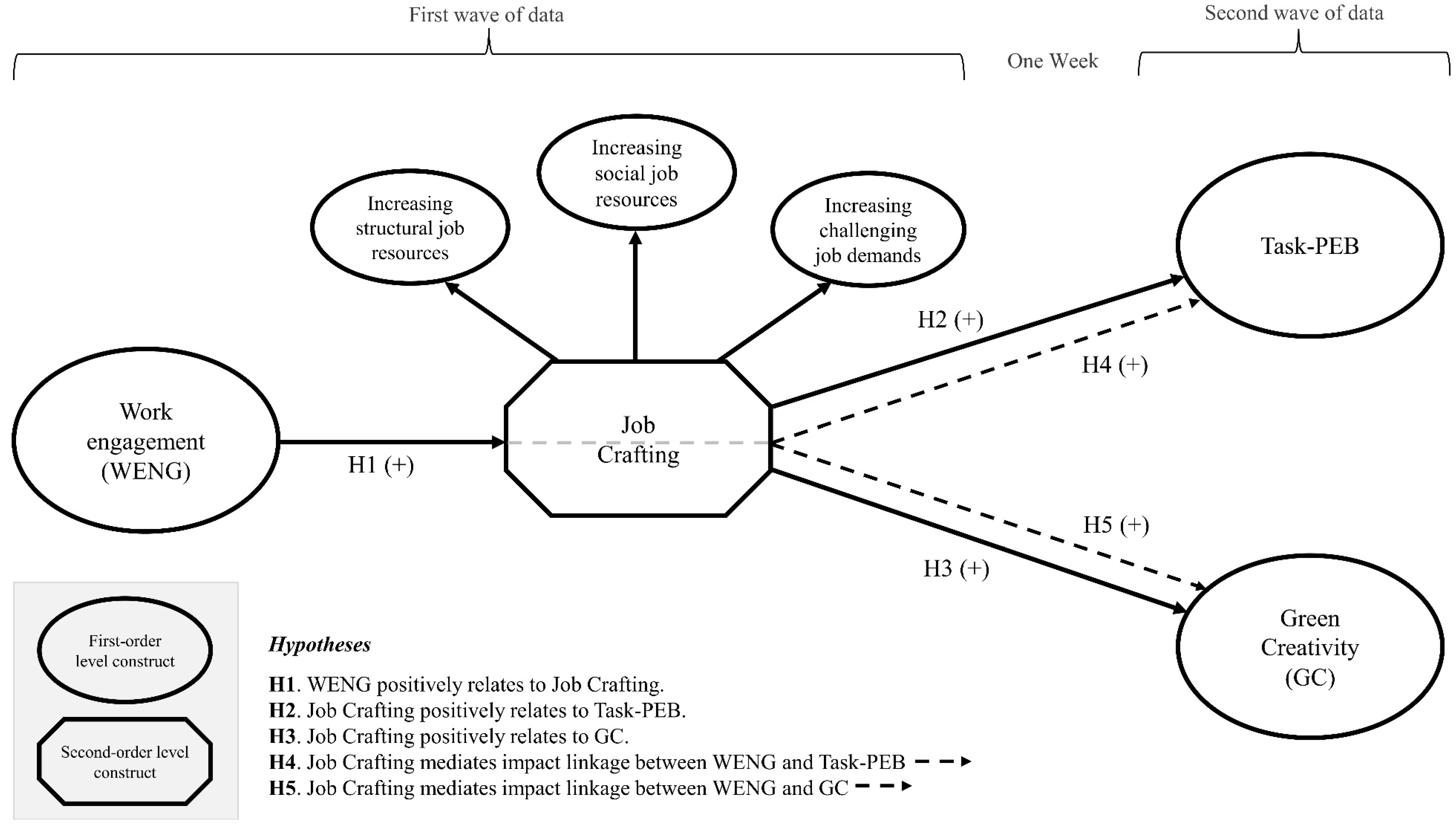 An investigation of the relevant studies demonstrates limited evidence about JC as a mediator linking WENG to performance outcomes. For example, the study of [38] indicated that JC was a mediator between WENG and job performance. In this paper, it is proposed that organizational members who are work-engaged craft their jobs based on their abilities and needs and therefore perform environmental and green tasks successfully. Although there is evidence regarding the link between WENG and green outcomes [15,16], to our knowledge, there is no empirical piece that has assessed the link between JC and hotel employees’ TPEBs and green creativity so far. As advanced by JD-R theory, a supportive work environment makes employees work with intensity, have positive emotions about the job, and devote much energy to the job [5]. Highly work-engaged employees possess personal resources as a coping style. These employees combine these job and personal resources with challenging JDs to craft their jobs for contributing to the hospitality firm’s ES and green initiatives. Employees high in WENG craft their jobs via resources as well as challenging JDs and are more likely to consider new responsibilities as meaningful. They may not only focus on job-related tasks but also investigate creative and novel solutions.