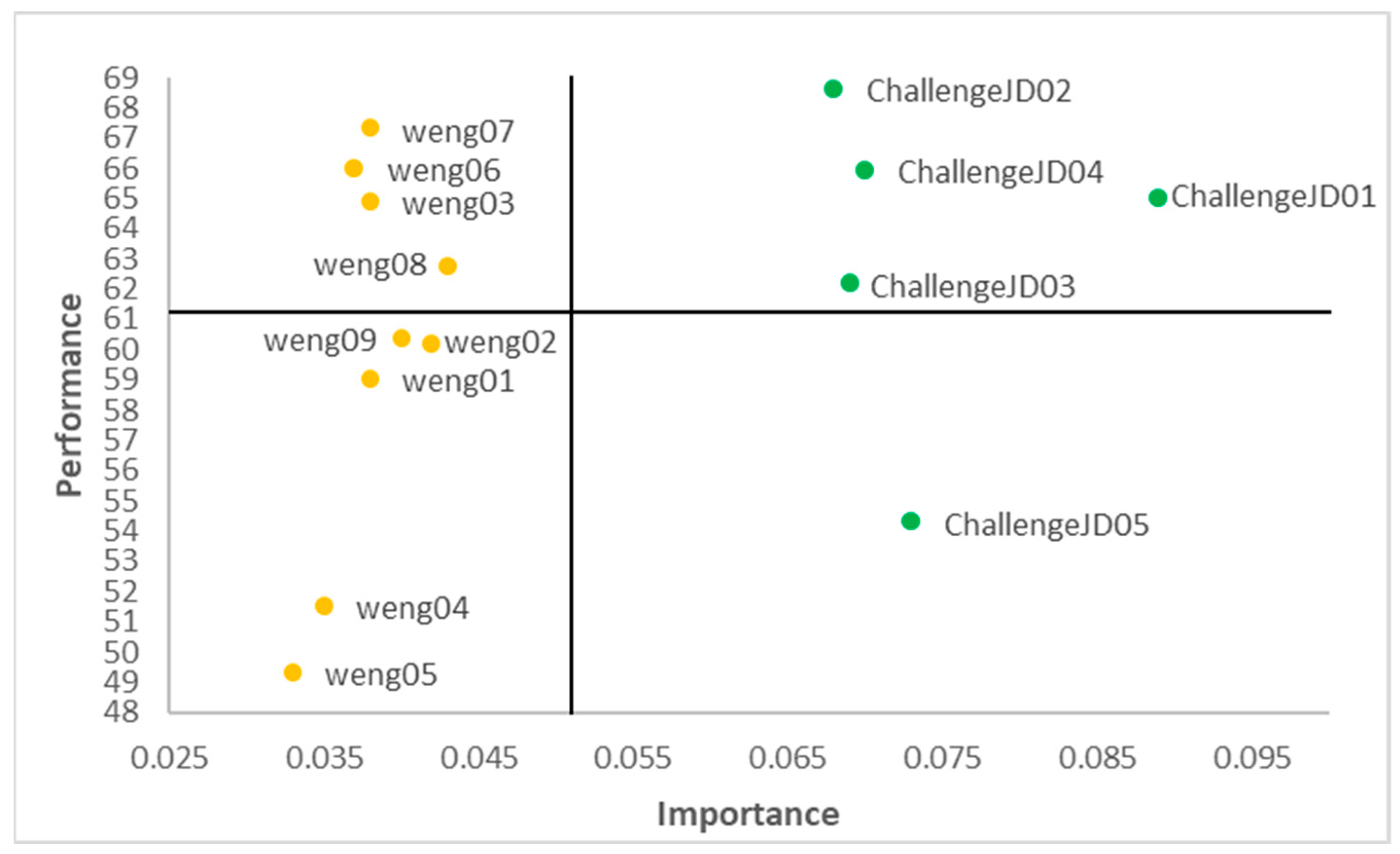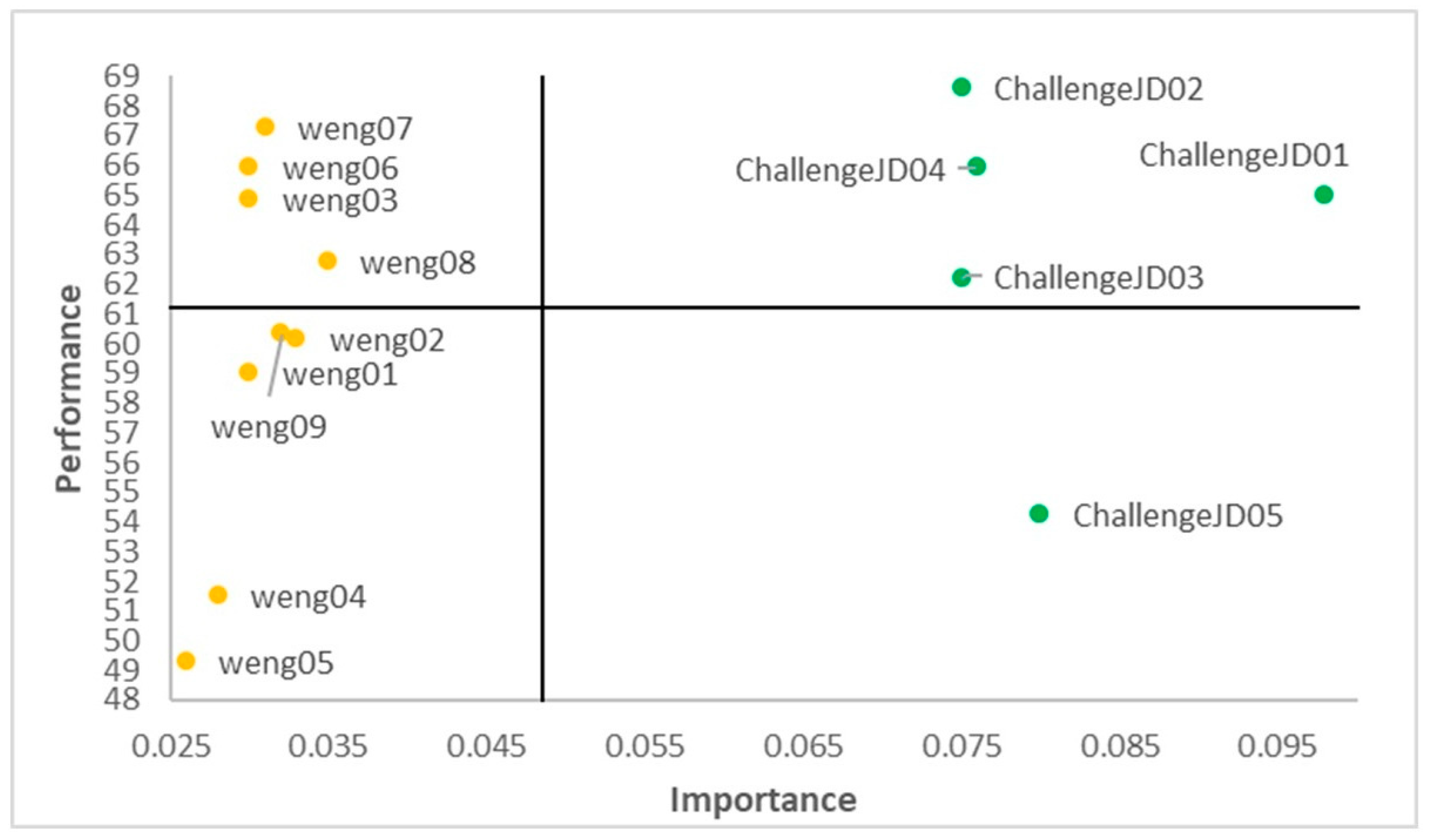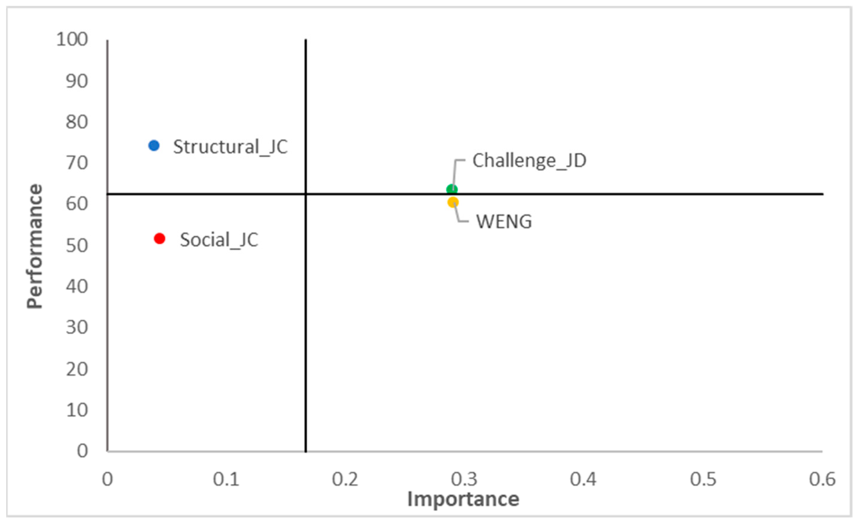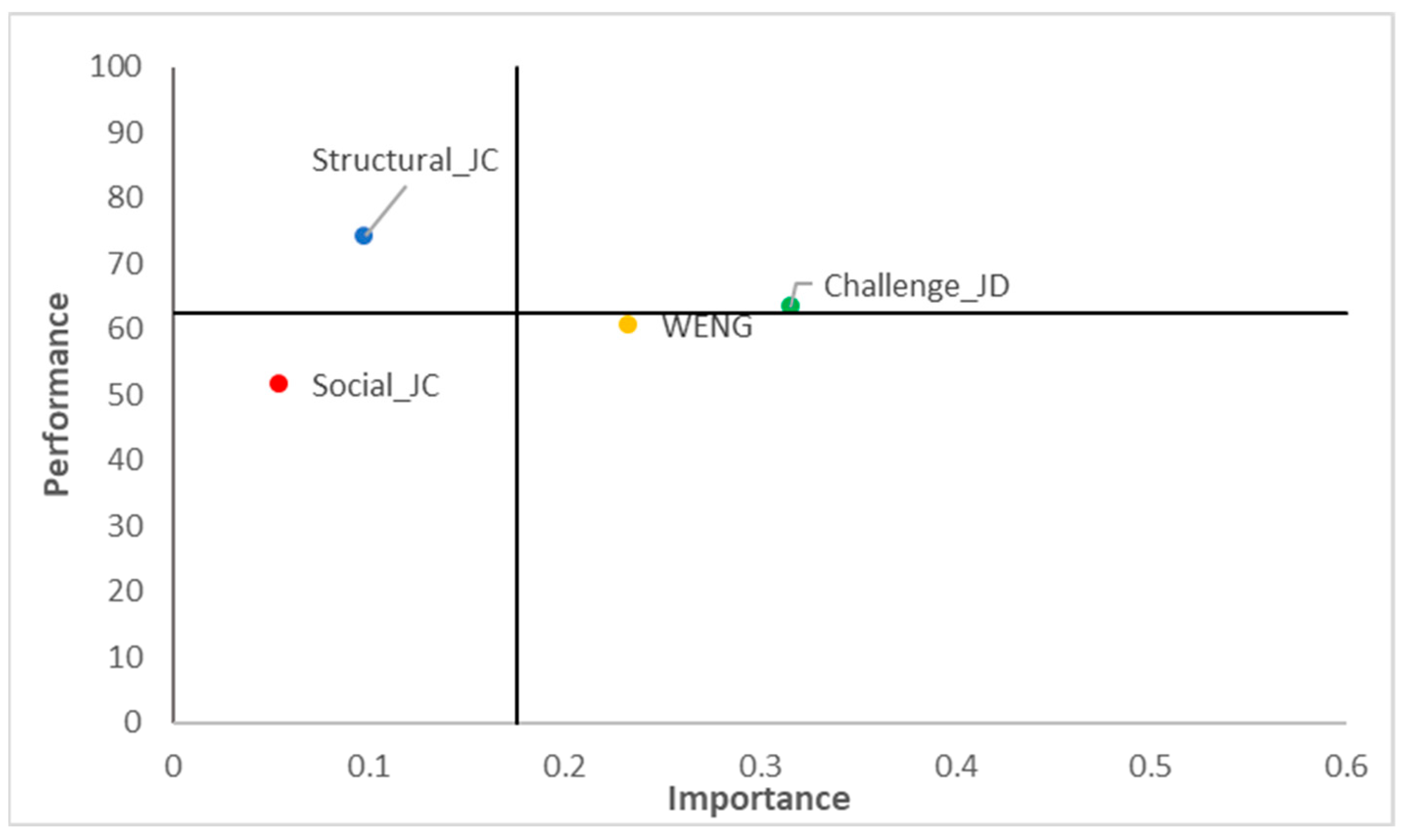Nine items from [4] were tapped to operationalize WENG (the predictor variable). Responses were coded via “6 (always)” and “0 (never)”. JC (the mediating variable) was measured with 15 items from [9]. Following instructions from [62] in the specification of higher-order constructs (HOCs), the variable was treated as a reflective second-order construct. The objective was to adequately capture three dimensions originally described by [9], that is, structural JRs, social JRs, and challenging JDs. Each dimension included five items. Responses were recorded as “5 (very often)” and “1 (never)”.