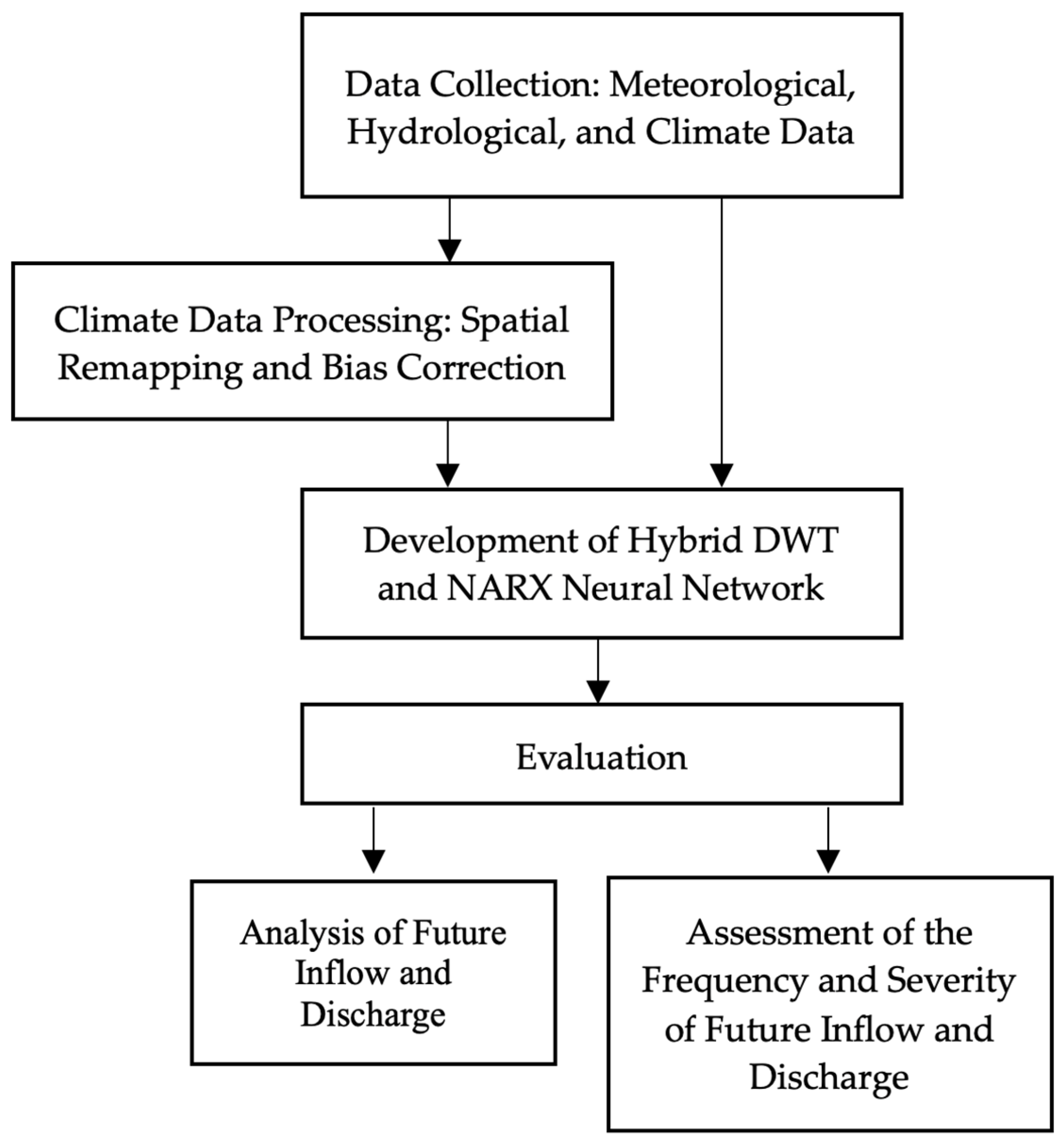 To address these issues, this study develops an advanced forecasting framework for reservoir inflow and discharge management in the CPRB. The approach incorporates climate projections refined by spatial remapping and bias correction to improve local applicability. DWT is used for extracting essential features from time-series data, and a NARX is applied for hydrological forecasting. The framework, summarized in Figure 2, begins with the collection of meteorological, hydrological, and climate data across the basin. Next, climate data undergo spatial remapping and bias correction to ensure the accuracy and local relevance of the Global Climate Model (GCM) projections. The refined data are then used to develop a hybrid forecasting model that integrates DWT for feature extraction with a Nonlinear Autoregressive Neural Network with Exogenous Inputs (NARX) for predictive modeling.