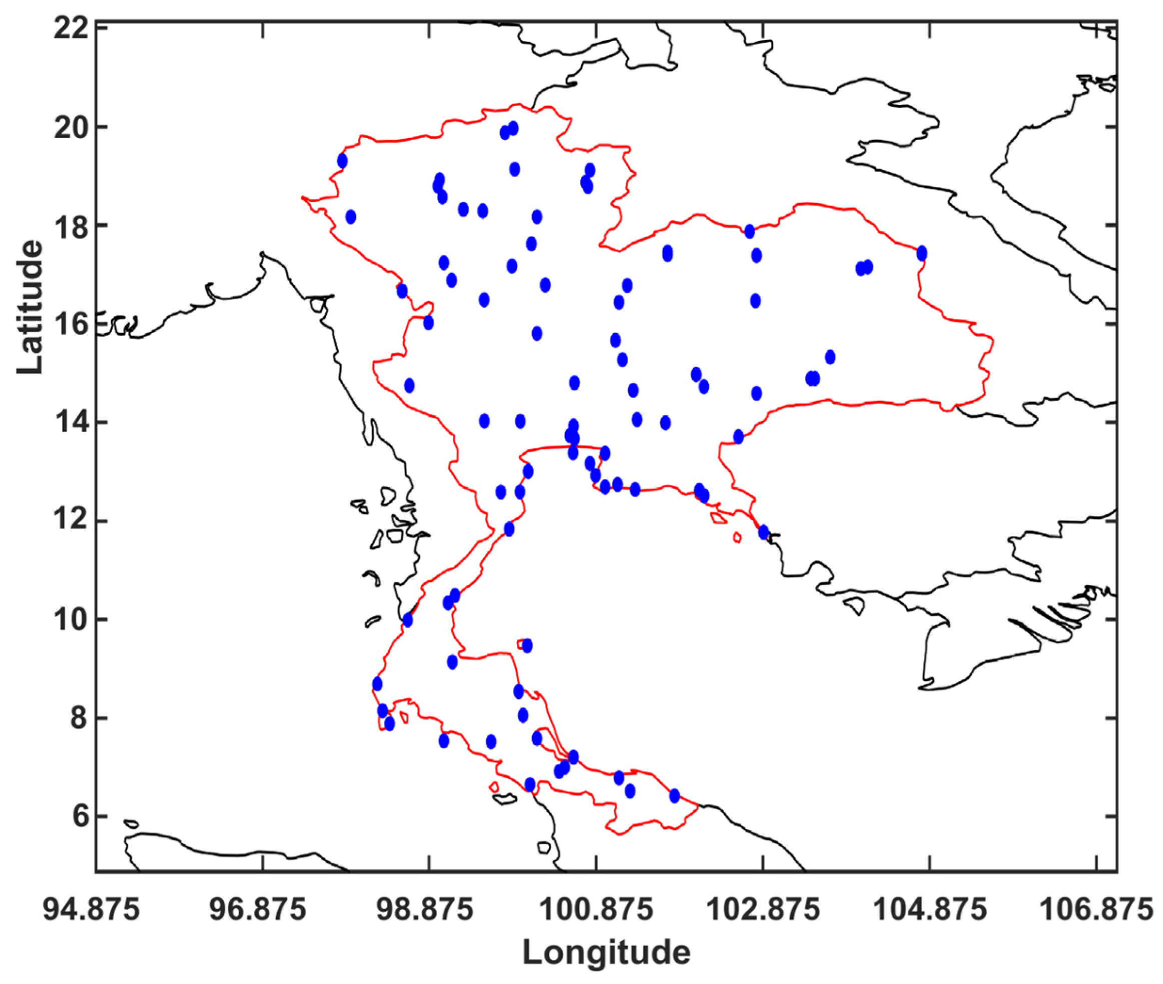 Figure 3. Spatial distribution of the 88 rainfall stations across Thailand (blue points), with the national boundary outlined in red.