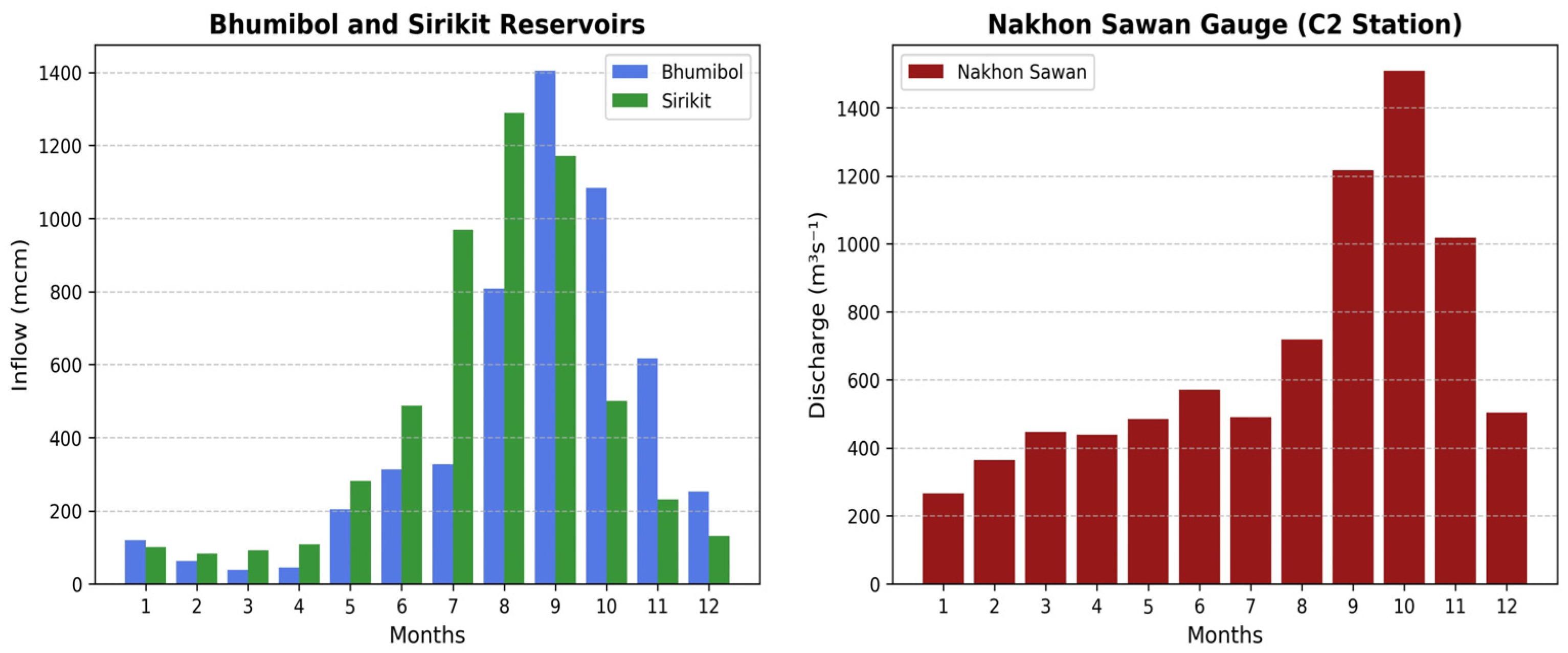 Hydrological data, including reservoir inflows and river discharge measurements, were collected to evaluate and forecast water availability and flood potential in the CPRB. The Electricity Generating Authority of Thailand (EGAT) provided monthly inflow records for the BB and SK reservoirs, which are Thailand’s largest and most critical water storage systems. The Royal Irrigation Department (RID) supplied monthly discharge data for the C2 for the same 1980–2005 period. The C2 station, located at the confluence of the Ping, Wang, Yom, and Nan rivers, serves as a key hydrological gauge for assessing downstream flood conditions.