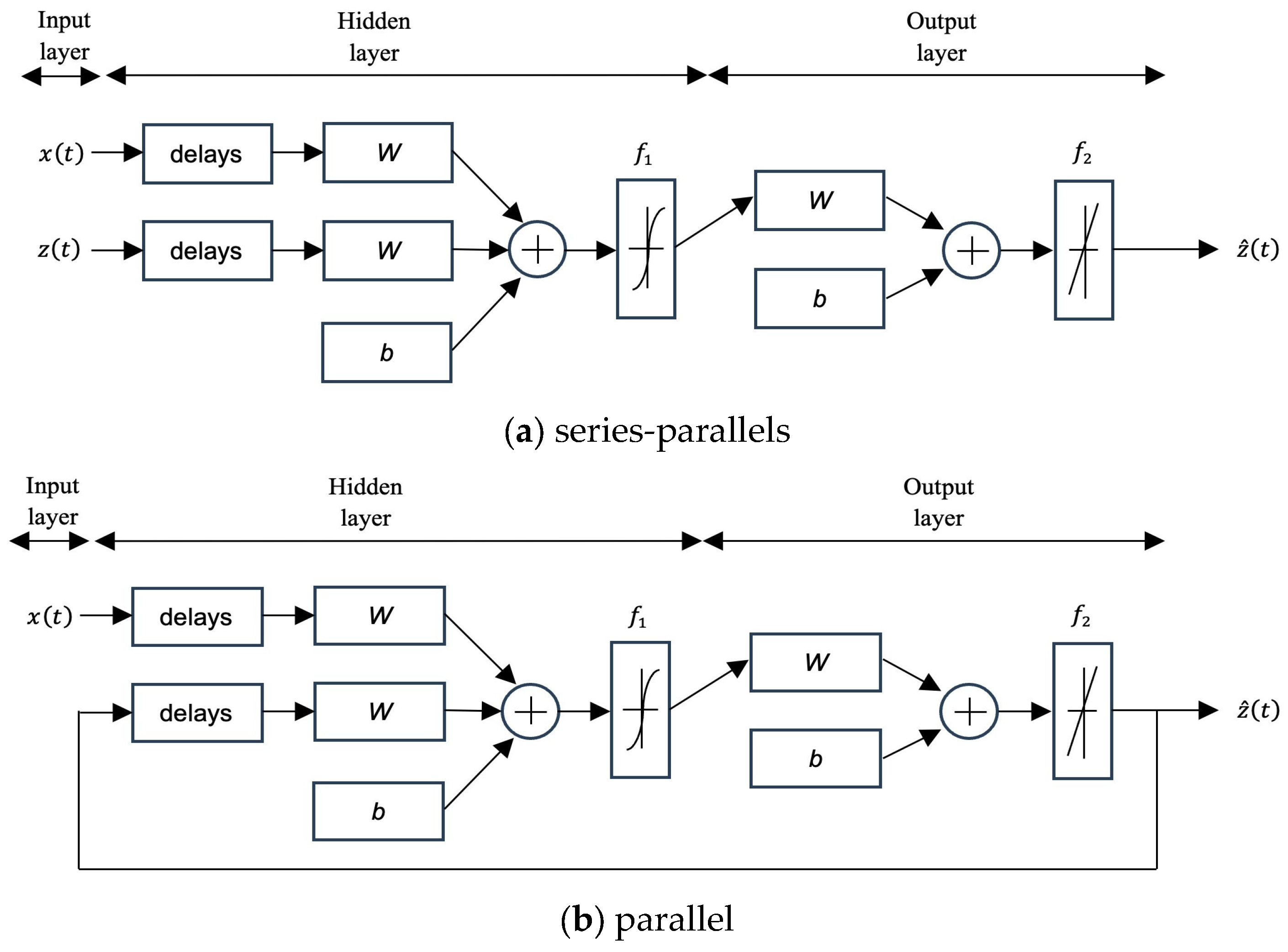 Figure 6. NARX network architectures: (a) series-parallel and (b) parallel.