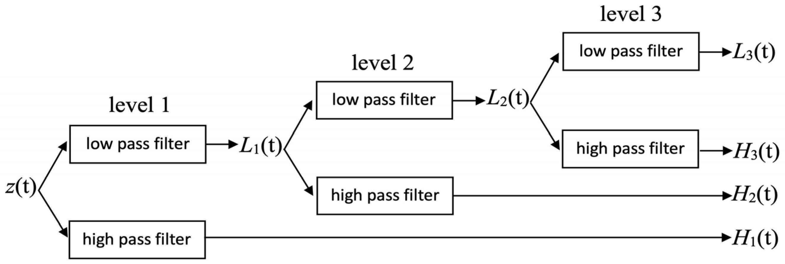 For a three-level decomposition of a time series z ( t ) , the approximation at level 3 and the details at levels h { 1,2 , 3 }   are:
