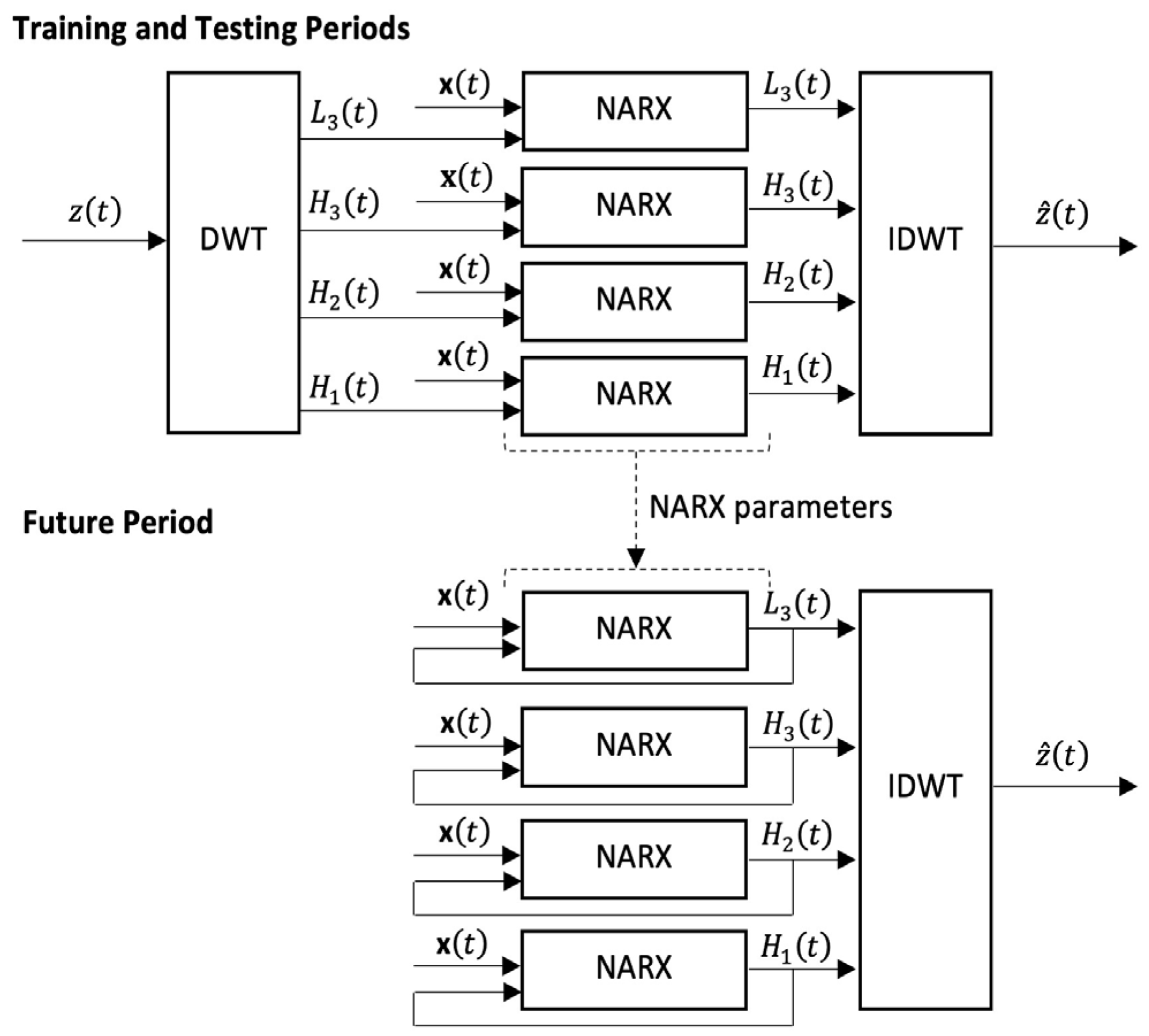Figure 8. DWT–NARX workflow with 3-level DWT, component-wise NARX models, and inverse DWT reconstruction.