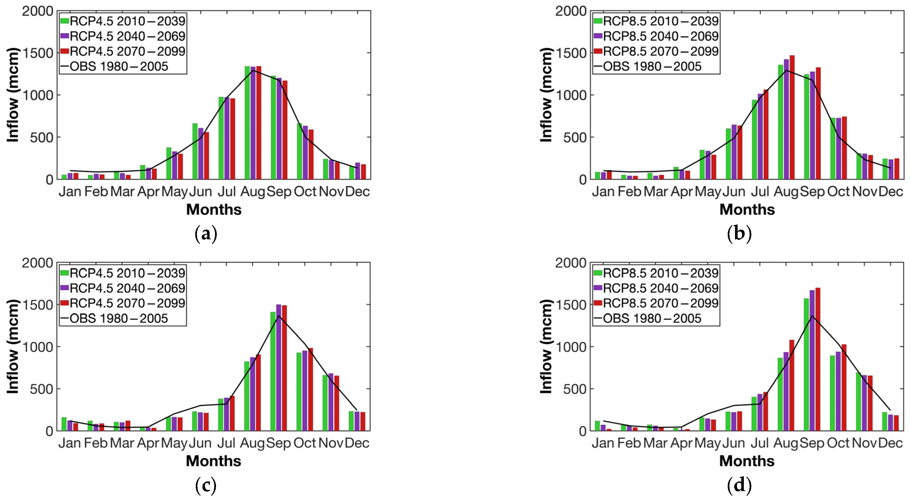 Figure 9. Annual inflow forecasts for the BB and SK reservoirs: (a) BB under the RCP4.5 scenario, (b) BB under the RCP8.5 scenario, (c) SK under the RCP4.5 scenario, and (d) SK under the RCP8.5 scenario.