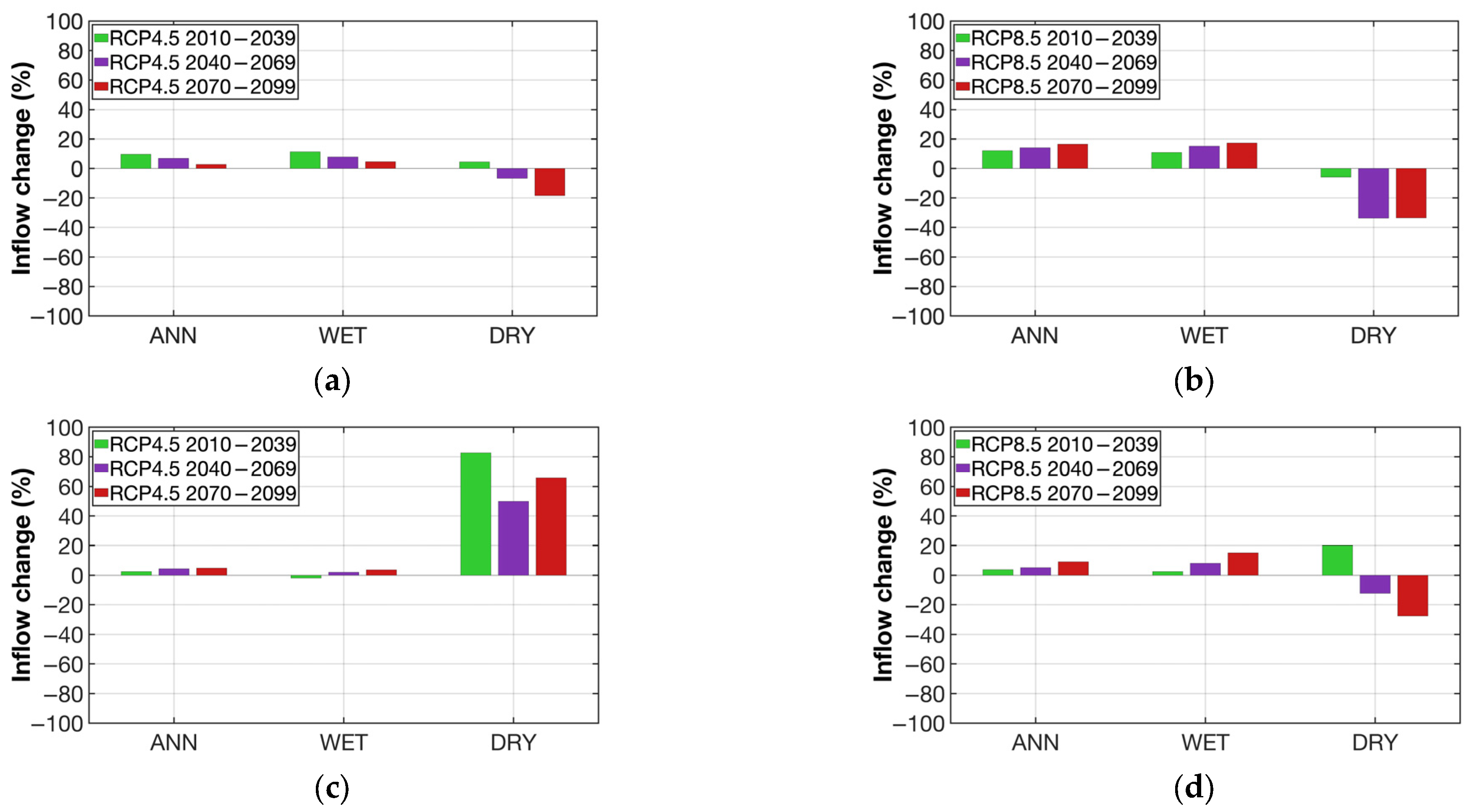 Figure 10. Changes in inflow magnitude for the annual (ANN), wet, and dry seasons for the BB and SK reservoirs in the short-term, medium-term, and long-term futures: (a) BB under the RCP4.5 scenario, (b) BB under the RCP8.5 scenario, (c) SK under the RCP4.5 scenario, and (d) SK under the RCP8.5 scenario..