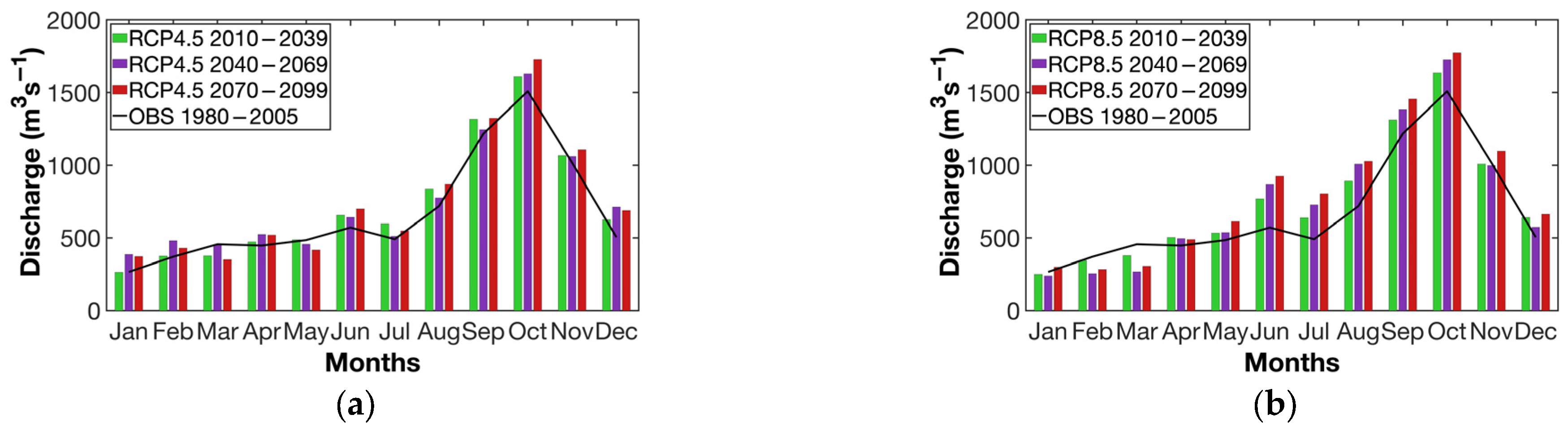 Two Representative Concentration Pathways (RCPs) were used: RCP4.5, representing a moderate emission scenario (radiative forcing of 4.5 W/m2), and RCP8.5, representing a high-emission scenario (8.5 W/m2). These scenarios facilitate a comparative analysis of potential hydrological changes under different greenhouse gas trajectories. Combining climate model projections with historical hydrological and meteorological observations strengthens the capacity to forecast future inflow and discharge variability. This integration supports improved flood preparedness, sustainable water allocation, and adaptive resource management across the CPRB.