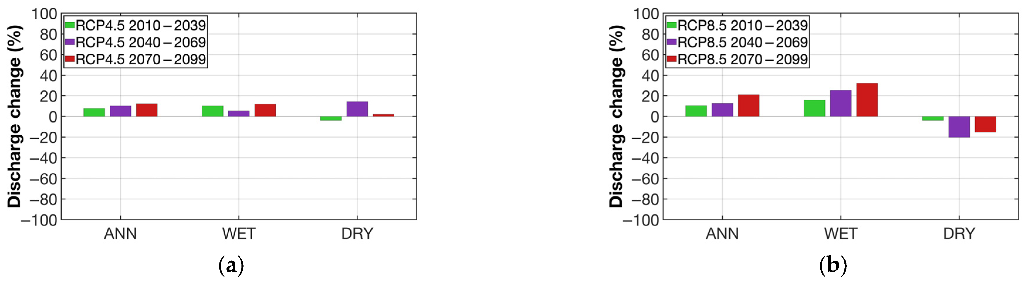 Figure 12. Changes in discharge magnitude for the annual (ANN), wet, and dry seasons at the C2 station for the short-term, medium-term, and long-term futures under (a) the RCP4.5 scenario and (b) the RCP8.5 scenario.