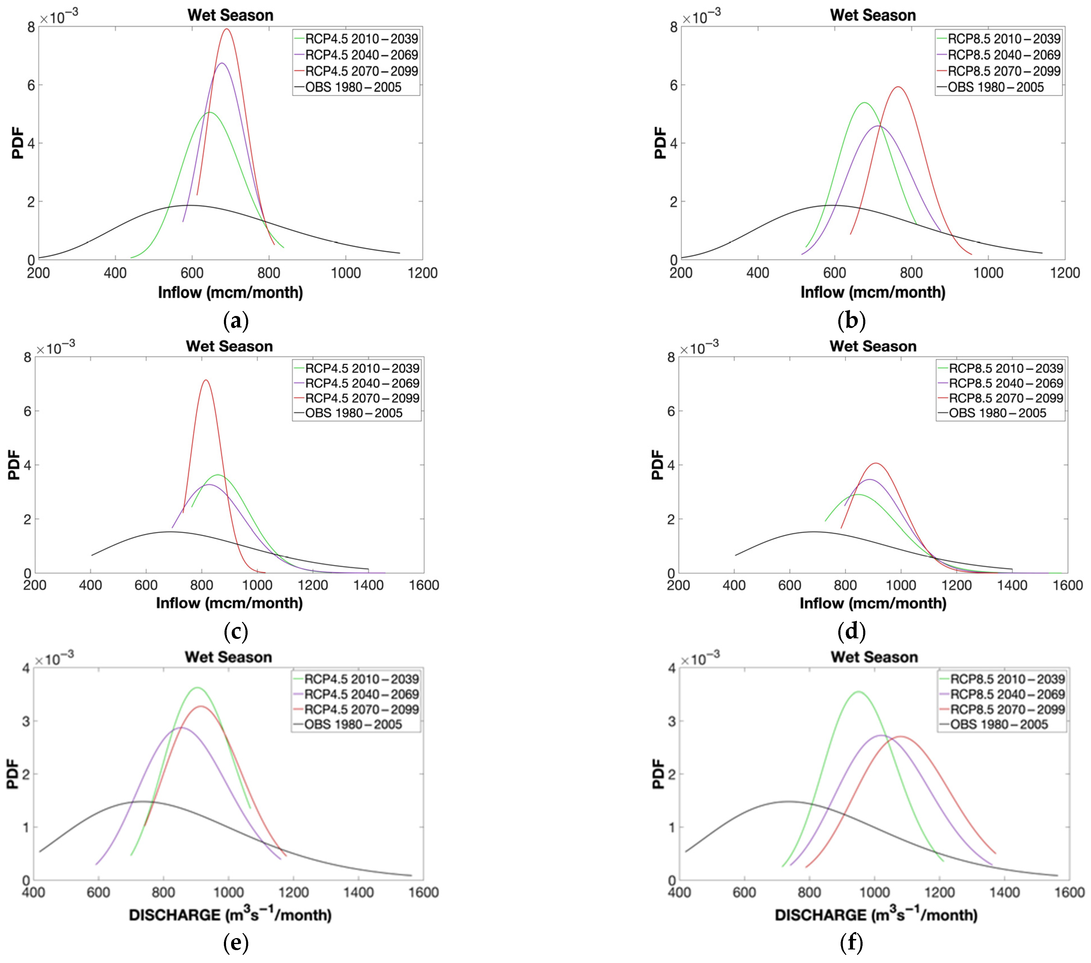 Figure 13. Probability density functions of wet-season inflow and discharge for the BB and SK reservoirs and the C2 station under future climate conditions: (a) BB under the RCP4.5 scenario, (b) BB under the RCP8.5 scenario, (c) SK under the RCP4.5 scenario, (d) SK under the RCP8.5 scenario, (e) C2 under the RCP4.5 scenario, ad (f) C2 under the RCP8.5 scenario.