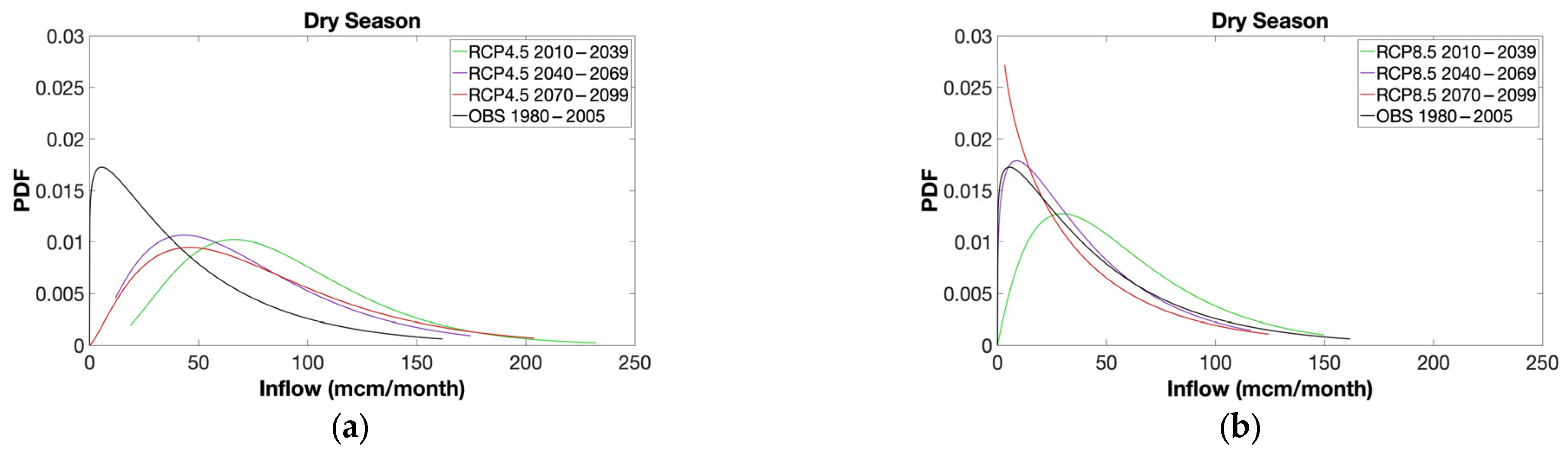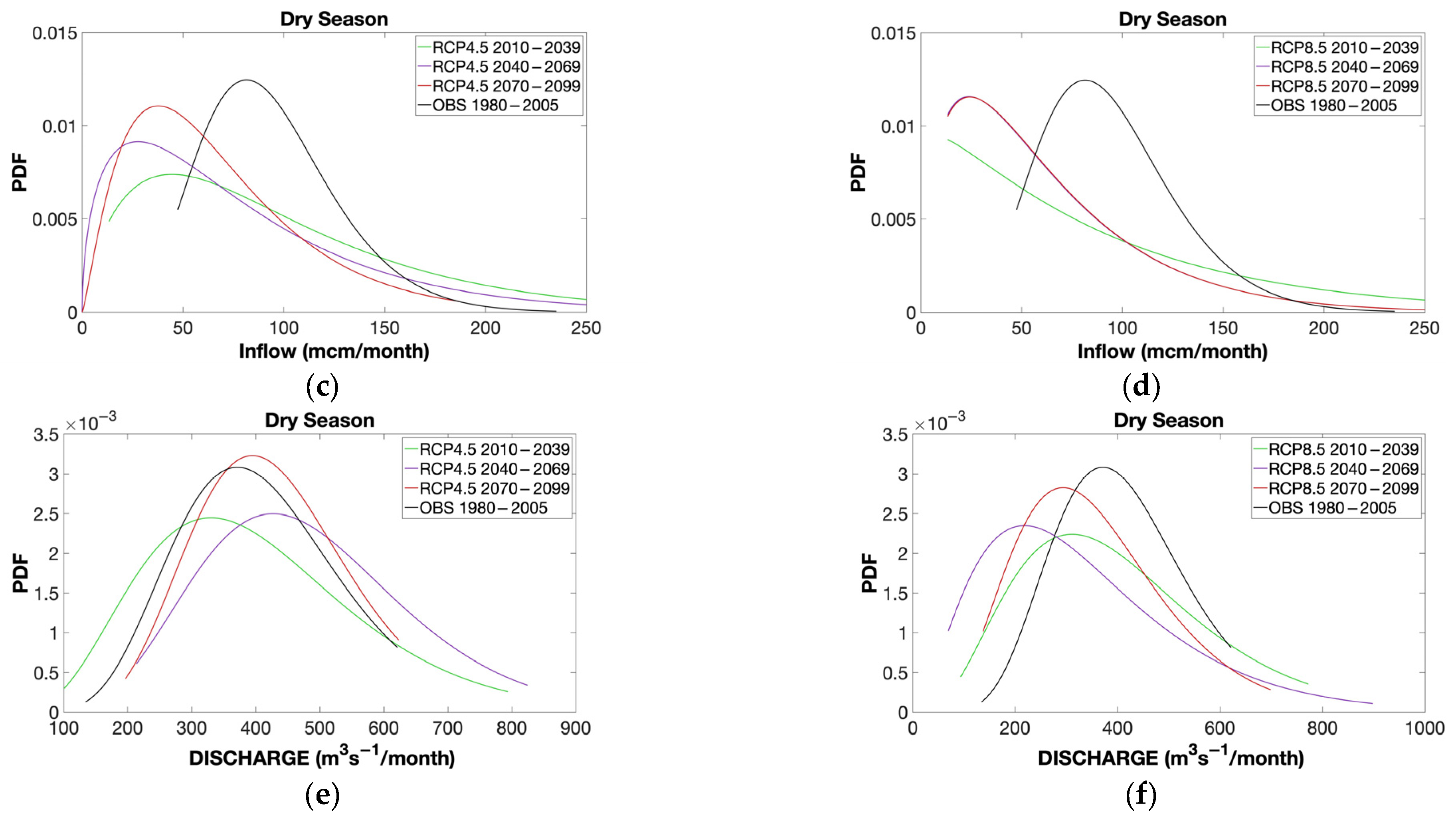 Figure 14. Gamma probability density functions of dry-season inflow and discharge for the BB and SK reservoirs and the C2 station under future climate conditions: (a) BB under the RCP4.5 scenario, (b) BB under the RCP8.5 scenario, (c) SK under the RCP4.5 scenario, (d) SK under the RCP8.5 scenario, (e) C2 under the RCP4.5 scenario, and (f) C2 under the RCP8.5 scenario.