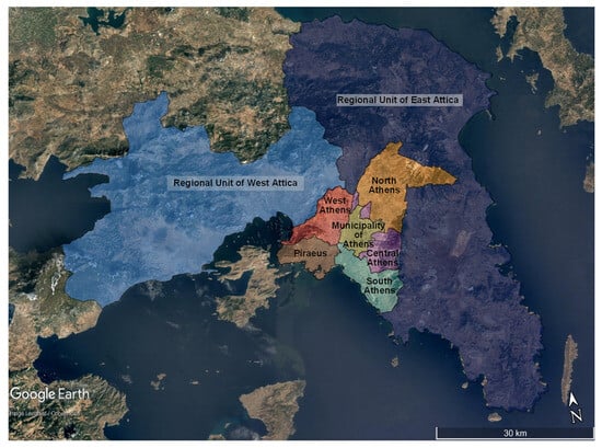 Athens is the capital city and the largest city, in terms of population, of Greece. It is in close proximity (12 km) to its port city Piraeus, which hosts one of Europe’s largest passenger and container ports. Both Athens and Piraeus occupy the Metropolitan Area of Athens, which spreads across 5 of the 8 regional units of the Region of Attica (West Athens, Central Athens, South Athens, North Athens, Piraeus) (Figure 1). The Metropolitan Area of Athens is located within the Attica basin, enclosed by five mountains (Egaleo and Poikilo to the west, Parnitha to the northwest, Penteli to the northeast and Hymettus to the east) and reaching the Saronic gulf (to the south). The geomorphology of the Attica basin, subjected to temperature inversion phenomena, combined with the emission of pollutants, can frequently reach unsafe air quality levels. Furthermore, the centre of Athens is densely built, with relatively narrow streets, creating urban canyons with a height/width ratio greater than 2 []. The current research examines urban green space use within four selected regional units of the Athens Metropolitan Area (West Athens, Central Athens, South Athens, Piraeus), which are characterised by greater building density and a lesser amount of green spaces than the remaining Athens Metropolitan Area.