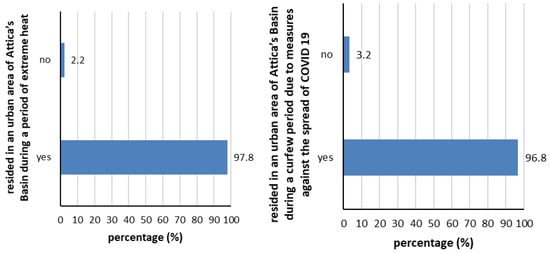 Nearly all participants have resided in an urban area within Attica during both a period of extreme heat (97.8%) and a curfew period due to measures against the spread of COVID-19 (96.8%) (Figure 2).