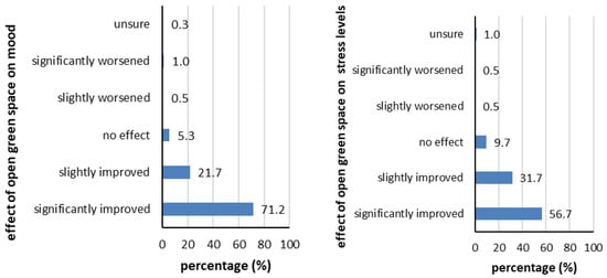 Effect of open green space visits on participants’ mood (Q17, left) and stress levels (Q18, right) expressed as percentage (%) of participant responses (N = 600).