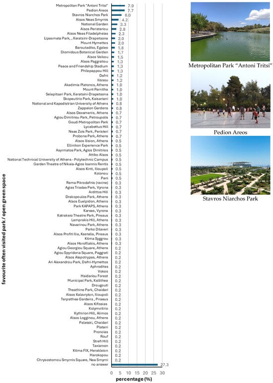 The distribution of the favourite most often visited green spaces identified by participants within the studied areas appears uneven, as most identified locations are collected in a circular arc-shaped area around the boarders of the four studied regional units, though less in the western and Pireaus regional units (Figure 8). The most popular green spaces identified by participants as the favourite most often visited are the Metropolitan Park “Antonis Tritsis,” Pedion Areos, and Stavros Niarchos Park (Figure 9).