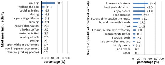 The most meaningful activity (Q25, left) and the greatest benefits of practiced activity (Q26, right) at the “favourite most visited green space” expressed as percentage (%) of participant responses (N = 600).