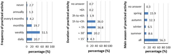 The most meaningful activity of participants is practiced weekly (51.5%), for approximately 1 h or between 1–3 h (36.9% and 36.0%, respectively) throughout the year (56.3%) (Figure 12).