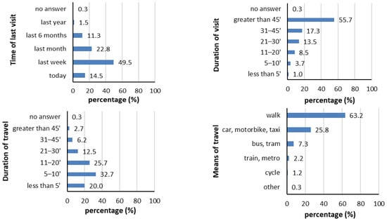 Time of last visit (Q30, top left), duration of travel (Q31, top right), duration of visit (Q32, bottom left) and means of travel (Q33, bottom right) to the “favourite most visited green space” expressed as percentage (%) of participant responses (N = 600).