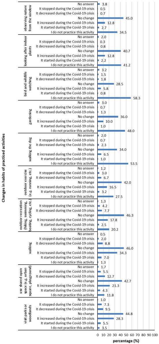 Most participants stated no changes in their habits for most of the activities practiced in green spaces due to COVID-19, though a relatively large number of participants stated to have increased their walking (34.3%) and visits to the parks or woodlands (28.3%) since COVID-19 (Figure 14). It is noteworthy to mention that most participants expressed not engaging in bird and wildlife watching (58.3%), gardening (48.0%), looking after indoor plants (41.2%), or walking the dog (53.5%) (Figure 14).