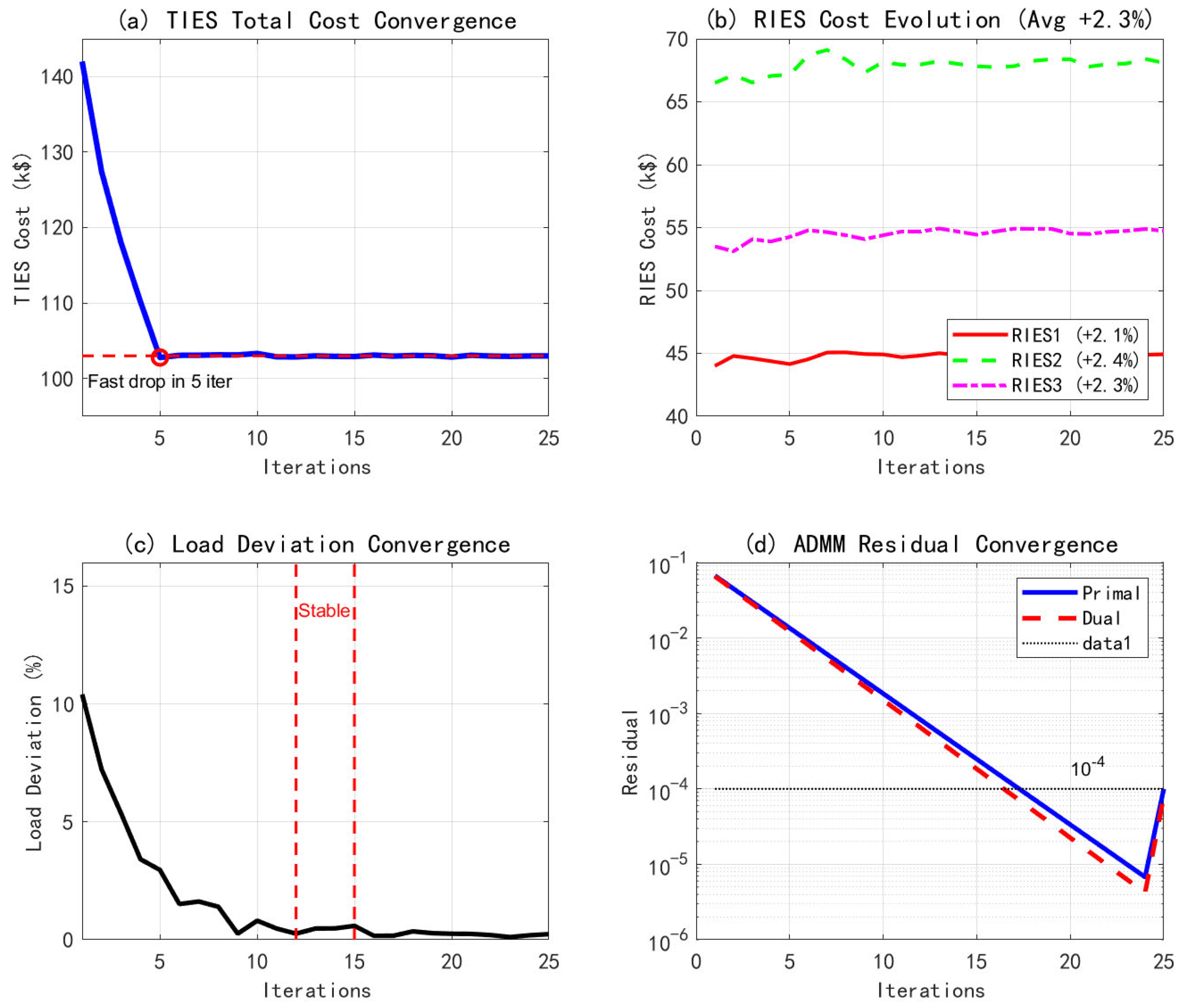 (4) Algorithmic superiority: The improved ADMM algorithm outperforms existing methods in terms of convergence speed, computational efficiency, and scalability and is particularly suitable for solving large-scale distributed IES optimization problems.