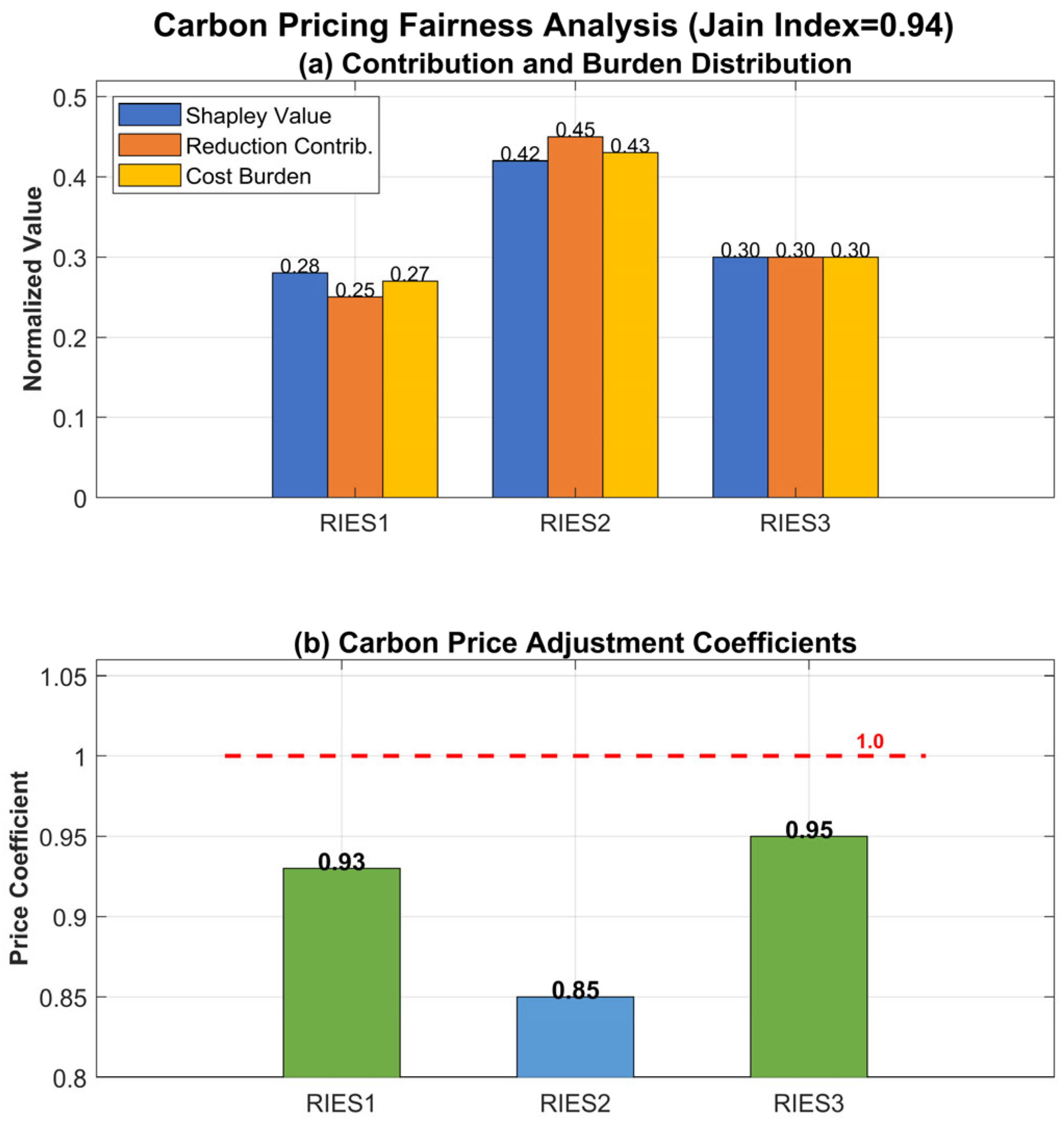 (2) Fairness mechanism: the carbon pricing mechanism based on Shapley’s value scientifically quantifies the emission reduction contribution of each subject and realizes the fair distribution of carbon responsibility; Jain’s fairness index reaches 0.94, which indicates that the mechanism takes into account the fairness while guaranteeing the efficiency.