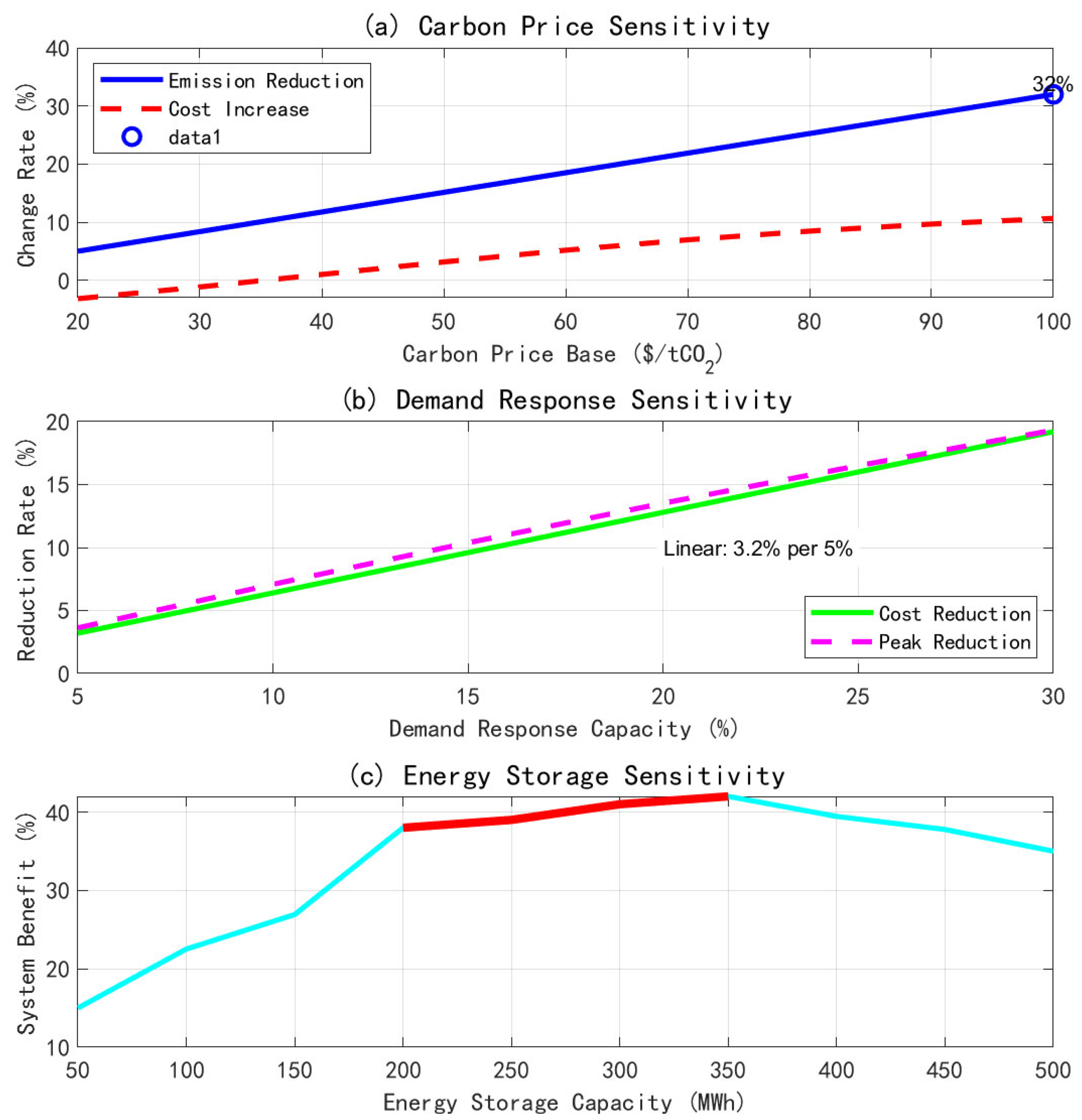 The sensitivity analysis provides guidance on parameter settings for practical applications. The carbon price benchmark level has the most significant impact on the system carbon emission. When the carbon price increases from 20/tCO2 to 100/tCO2, the carbon emission is reduced by 32%, which verifies the effectiveness of the carbon price mechanism. For every 5% increase in demand response capability, the system cost is reduced by 3.2%, showing a good linear relationship. The energy storage capacity has the best economy in the range of 200–350 MWh, and over-allocation will lead to diminishing marginal benefits.