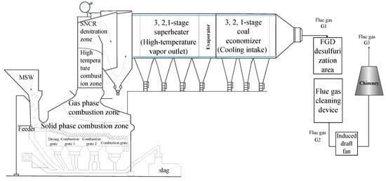 As shown in Figure 1, MSW is dumped by sanitation vehicles into storage tanks for fermentation and dehydration to ensure the low calorific value required for incineration. The original MSW contains a small amount of nitrogen-containing and sulfur-containing compounds, as well as various N and S elements. Firstly, the feeder pushes the MSW into the incinerator, where the combustible components are sequentially burned through drying, combustion grate 1, combustion grate 2, and burnout grate. To ensure the complete decomposition of the harmful gases generated during the solid-state combustion of MSW, the gas-phase combustion process must adhere to strict requirements. These include maintaining the flue gas temperature above 850 °C, ensuring that the high-temperature flue gas stays in the furnace for more than 2 s, and promoting sufficient turbulence in the flue gas. Once the combustion process is completed, the high-temperature flue gas enters the waste heat recovery system, where it exchanges heat with the liquid water in the boiler drum to generate high-temperature steam. After cooling, the outlet flue gas temperature from the waste heat boiler is reduced to below 200 °C. Additionally, after undergoing FGD desulfurization and bag dust removal, the flue gas is discharged through the chimney.