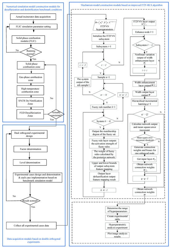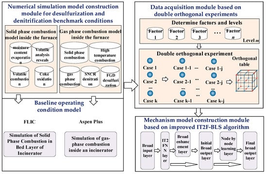 The proposed strategy is shown in Figure 3, including the numerical simulation model construction module for desulfurization and denitrification benchmark conditions, the data acquisition module based on double orthogonal experiments, and the mechanism model construction module based on an improved IT2FBLS algorithm.
