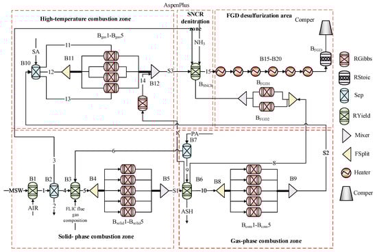 The overall numerical simulation model of gas-phase combustion based on Aspen Plus is shown in Figure 4.