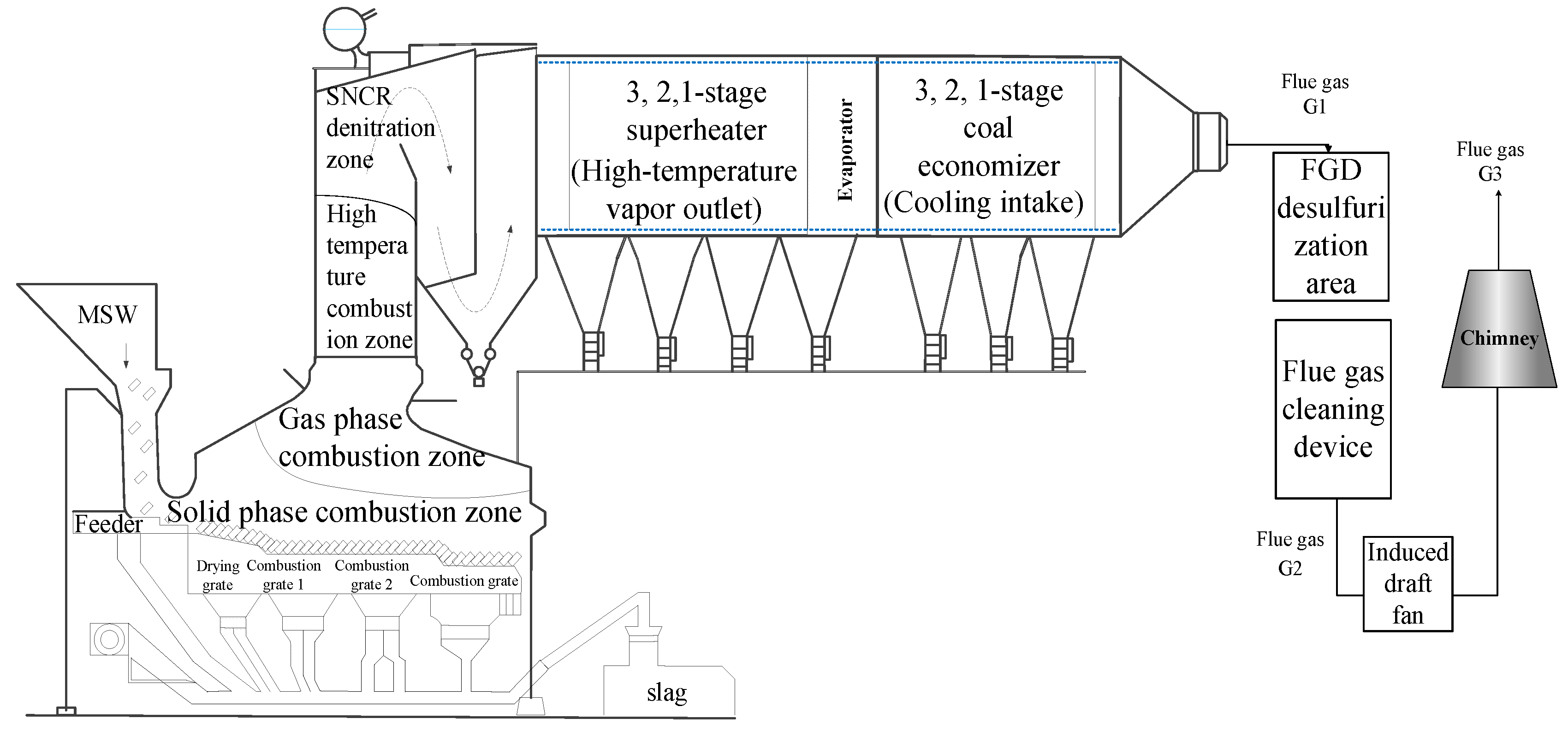 The gas released by high-temperature MSW in the furnace mixes with the surrounding air and rapidly burns. Simplified gaseous combustible volatiles include CmHn and CO, and their combustion reactions are as follows: