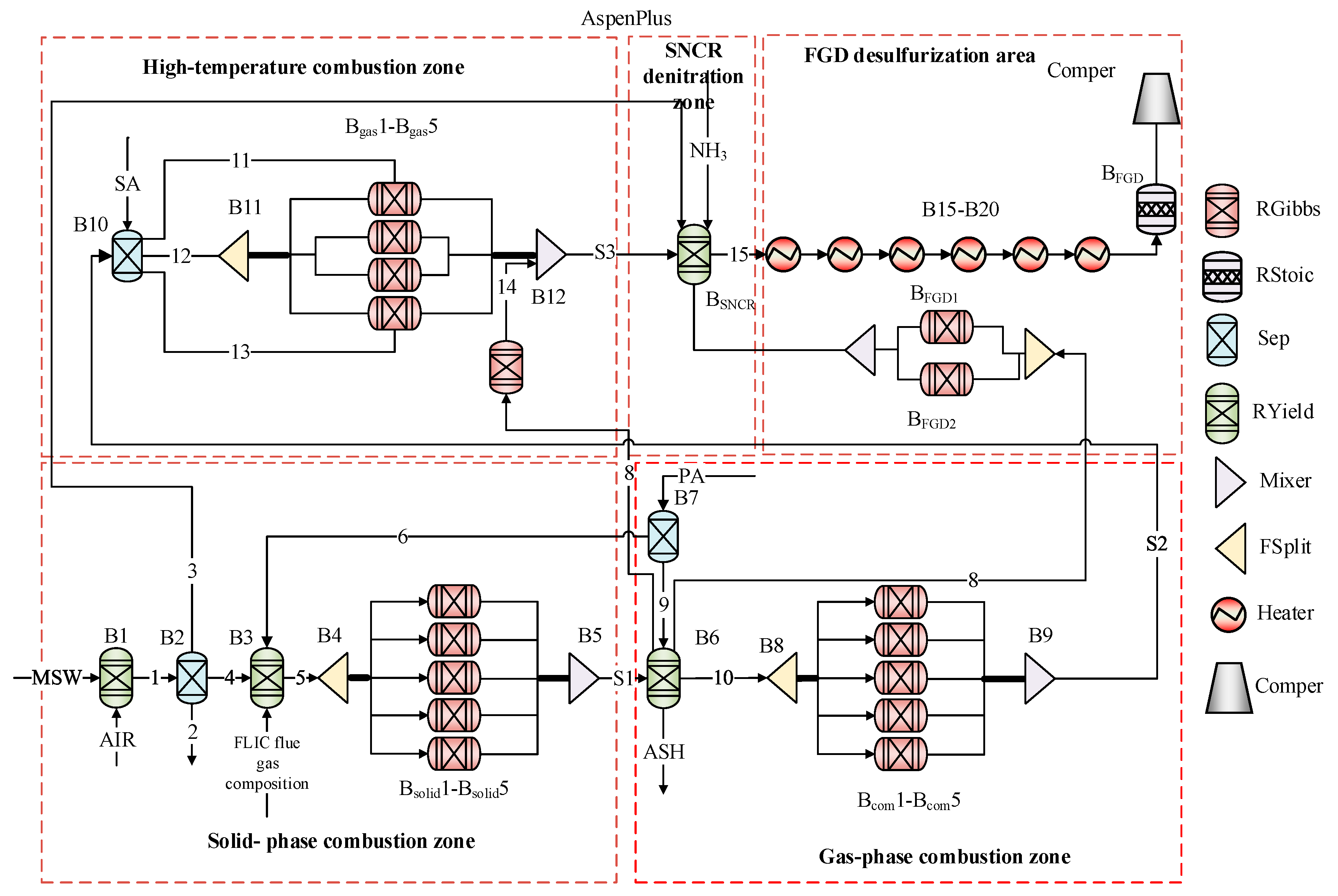 We adopt a multi-software coupling mode to simulate the internal combustion process of the incinerator, which is divided into a solid-phase combustion process on the bed and a gas-phase combustion process above the grate. The solid-phase combustion process on the bed is numerically simulated using FLIC, and the calculation results are imported into Aspen Plus V12.1 as the boundary conditions for the grate bed inlet. Then, a gas-phase combustion simulation is carried out in Aspen Plus V12.1. Considering the uncertainty of MSW composition and the complexity of the combustion process, a steady-state analysis is conducted under the following assumptions: the incinerator is in a stable operating state, the reactions inside the furnace can reach equilibrium, and the temperature and pressure of each reactor are constant without considering pressure loss and heat loss; during the entire incineration process, assuming uniform air distribution, it can fully react with MSW; the main components of MSW are C, H, O, N, S, and Cl, among which C is converted into gas and ash; ash does not participate in the reaction; the gas-phase N element reacts to generate gas compounds; solid N reacts alone to generate NO; the S element generates SO2 and SO3; the Cl element generates HCl. Due to the complex composition of tar, its related reactions are not included in the simulation process.