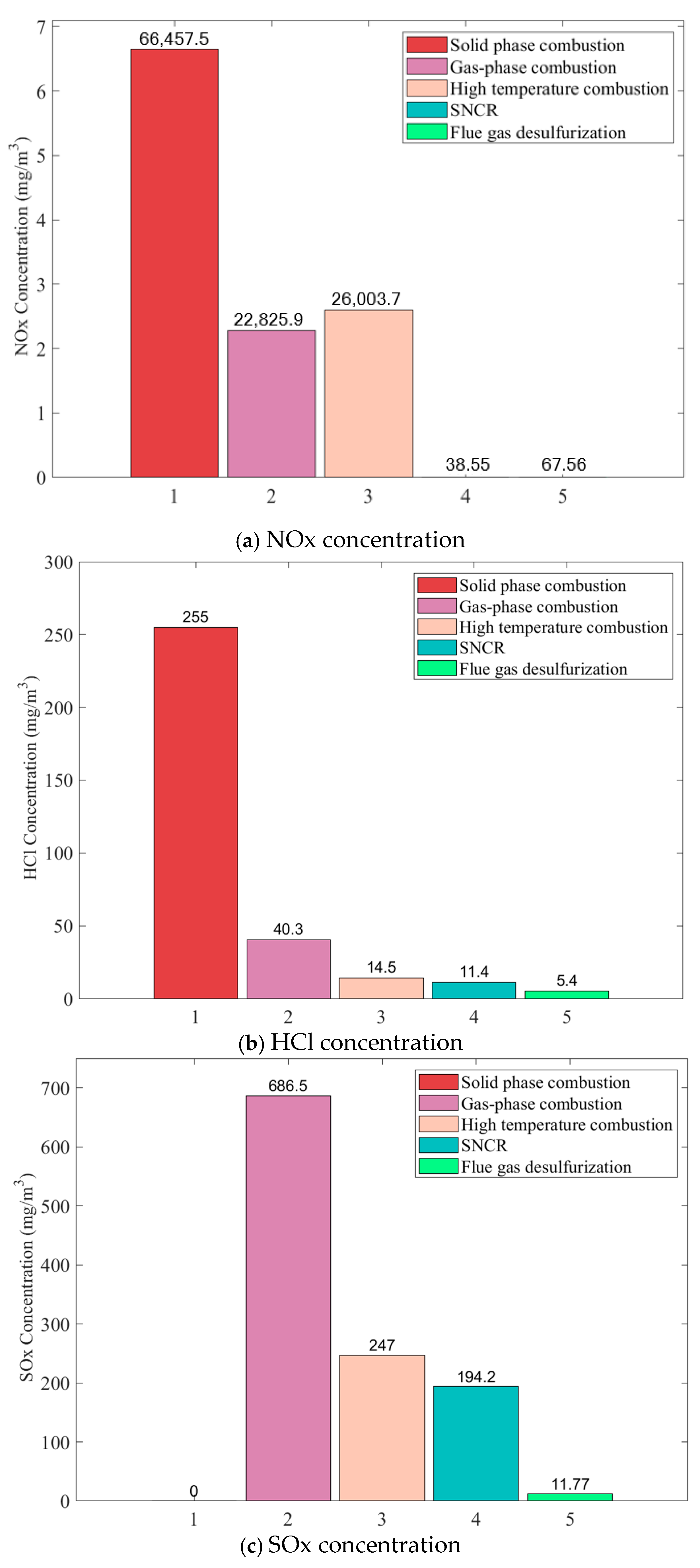 This module is the location with the highest NOx concentration in the whole MSWI process because, at this temperature, many intermediate products like HCN and NH3 are decomposed into NOx. Additionally, fixed nitrogen undergoes conversion reactions. In this zone, sulfur (S) appears in the form of SO2 and SO3, while chlorine (Cl) is present as HCl and Cl2.
