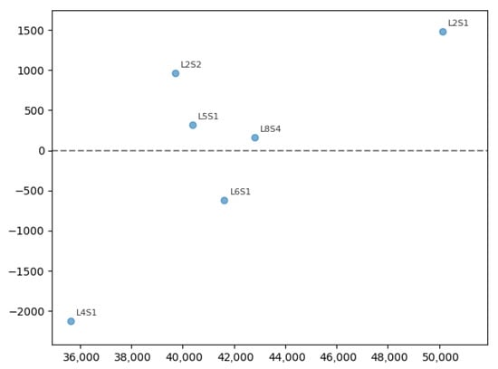 Regarding residuals versus model predictions (Figure 5), the horizontal axis corresponds to estimated yield (kg ha−1), and the vertical axis corresponds to residual ; each point represents an observation from the test set (plots) and is labeled with its case identifier, allowing individual tracking of plots with peculiar errors. Positive residuals (above the dashed line at zero) indicate model underestimations (actual yield was greater than predicted), while negative residuals reflect overestimations.